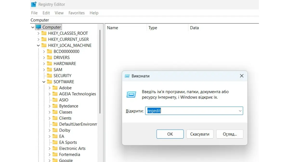 - Очищення реєстру: Через команду regedit відкривається доступ до бази даних налаштувань. Тут важливо перевірити гілки HKEY_CURRENT_USER\Software та HKEY_LOCAL_MACHINE\SOFTWARE. Видалення папок із назвою програми в цих розділах обнулює інформацію про програмне забезпечення в системі.