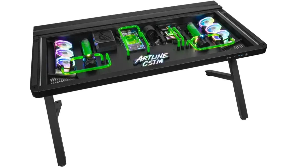 Замыкає список DeskPro v17 – наше найтехнологічніше рішення, де системний блок інтегровано прямо в конструкцію моторизованого стола. Ви можете змінювати висоту робочого місця однією кнопкою, а під стільницею із загартованого скла працюватиме зв’язка AMD 16-core Ryzen 9 9950X3D та RTX 5090 на кастомному водяному охолодженні з жорсткими трубками. Такий формат повністю вирішує проблему «лапші» з проводів і дає величезний запас по охолодженню за рахунок об’єму стола та винесених радіаторів.