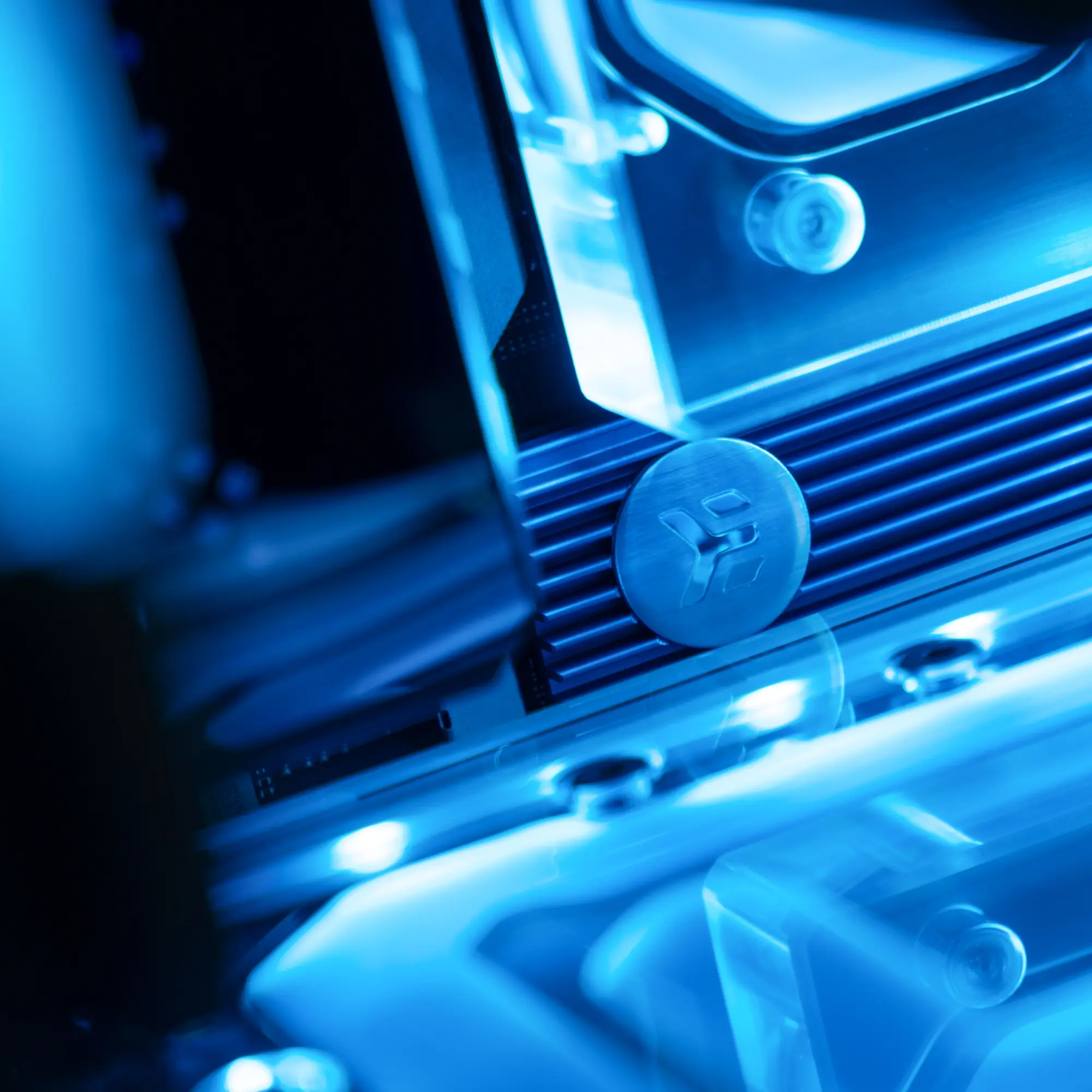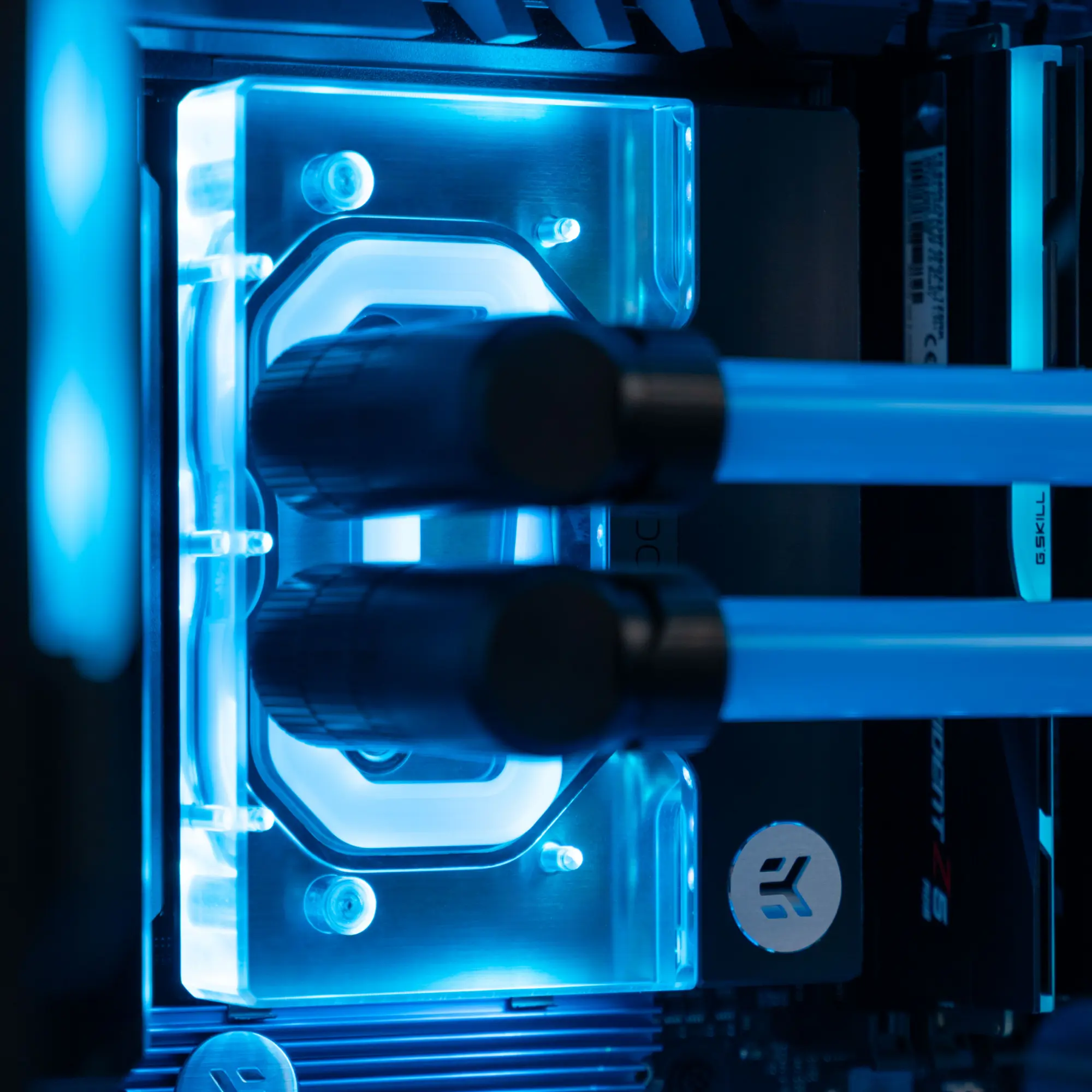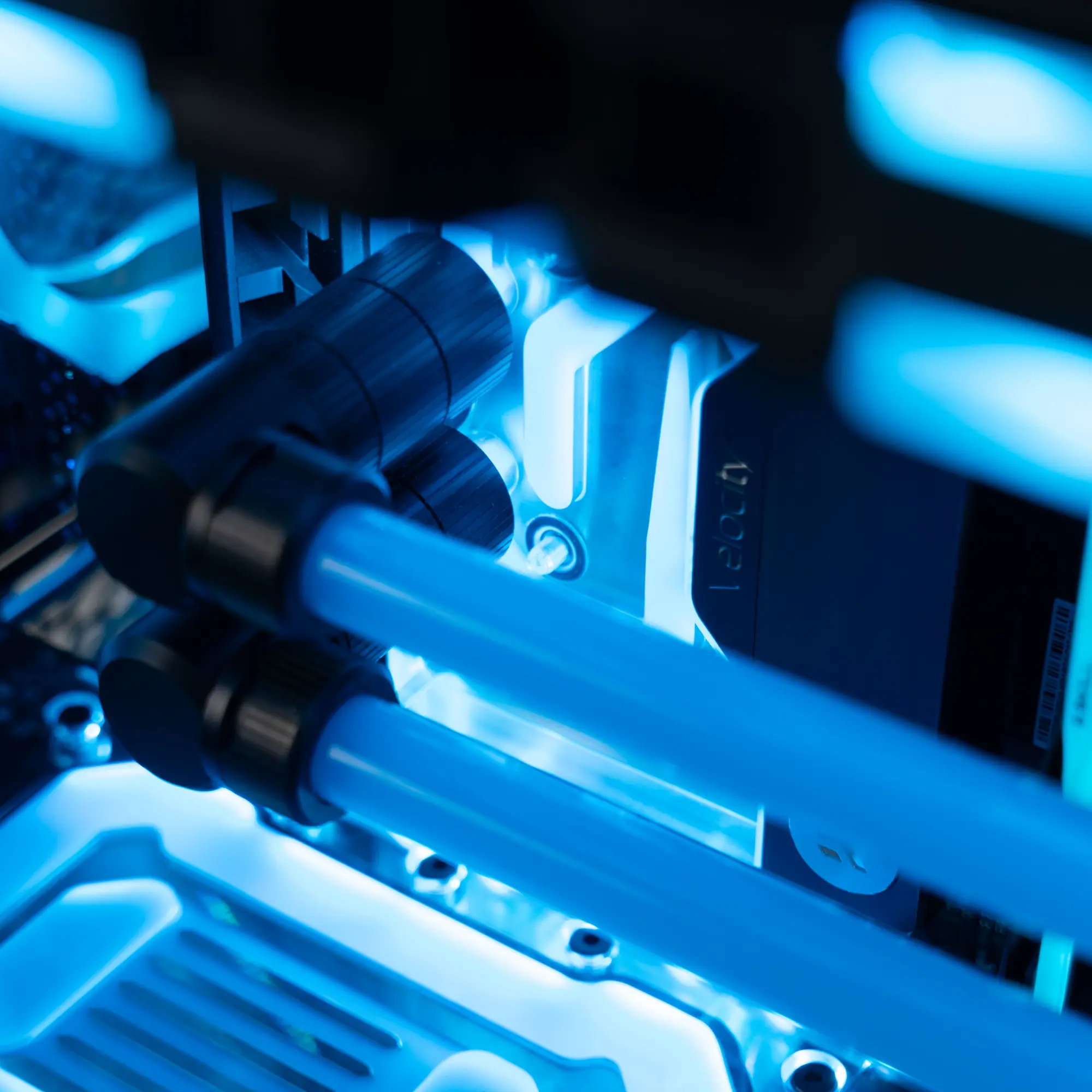 Особливу увагу привертає організація внутрішнього простору: розподільні пластини з яскравим підсвічуванням, ідеально прокладені прозорі трубки СВО і масивні радіатори створюють відчуття інженерної досконалості. Синхронізоване RGB-підсвічування дає глибоке блакитне світло, яке розсіюється по всій системі і підкреслює кожну деталь конструкції. Ефект підсилюється акуратним укладанням кабелів в кольоровій оплетці — інтер'єр корпусу виглядає максимально чисто і стильно.