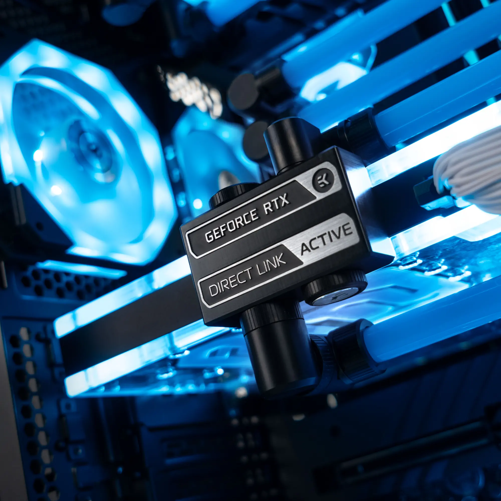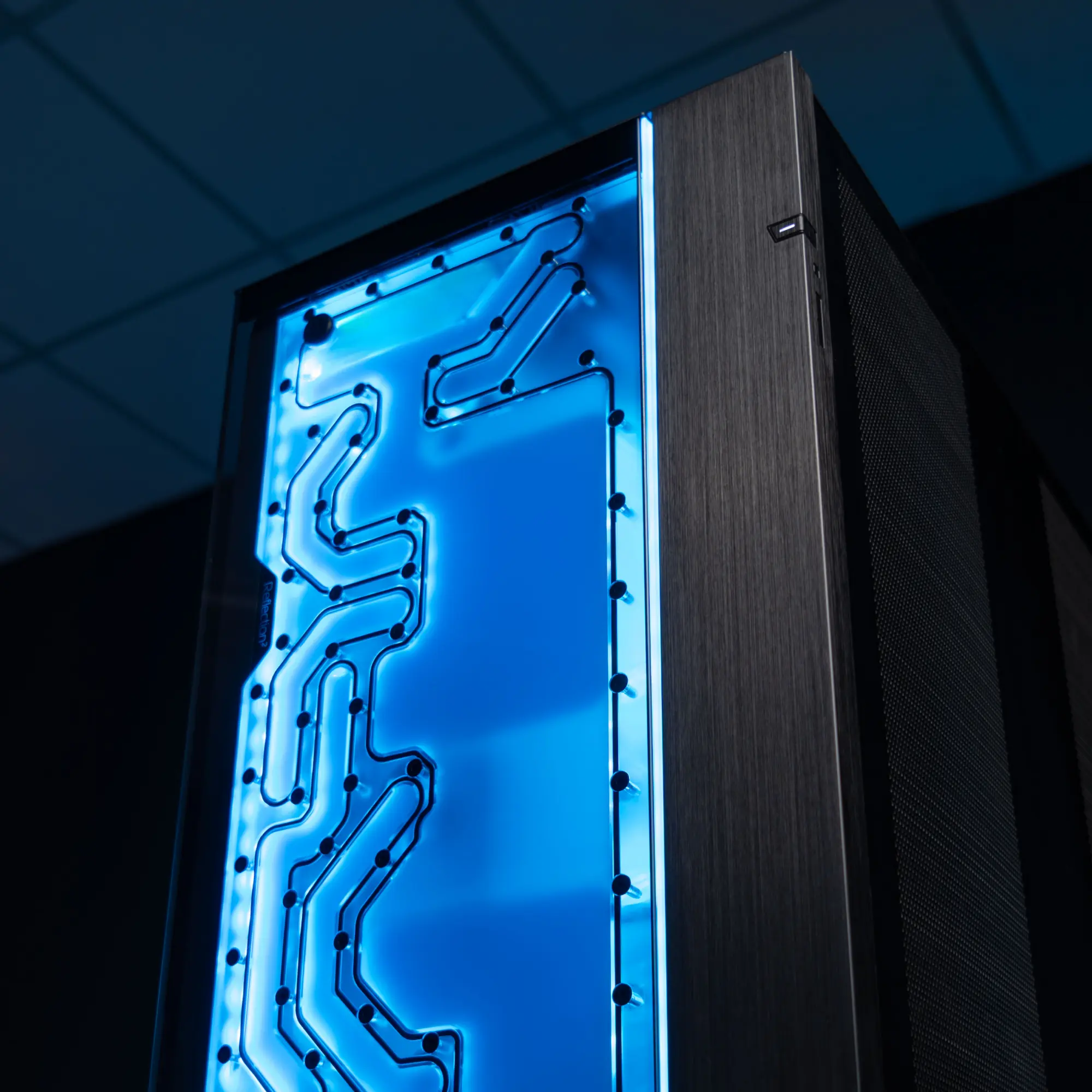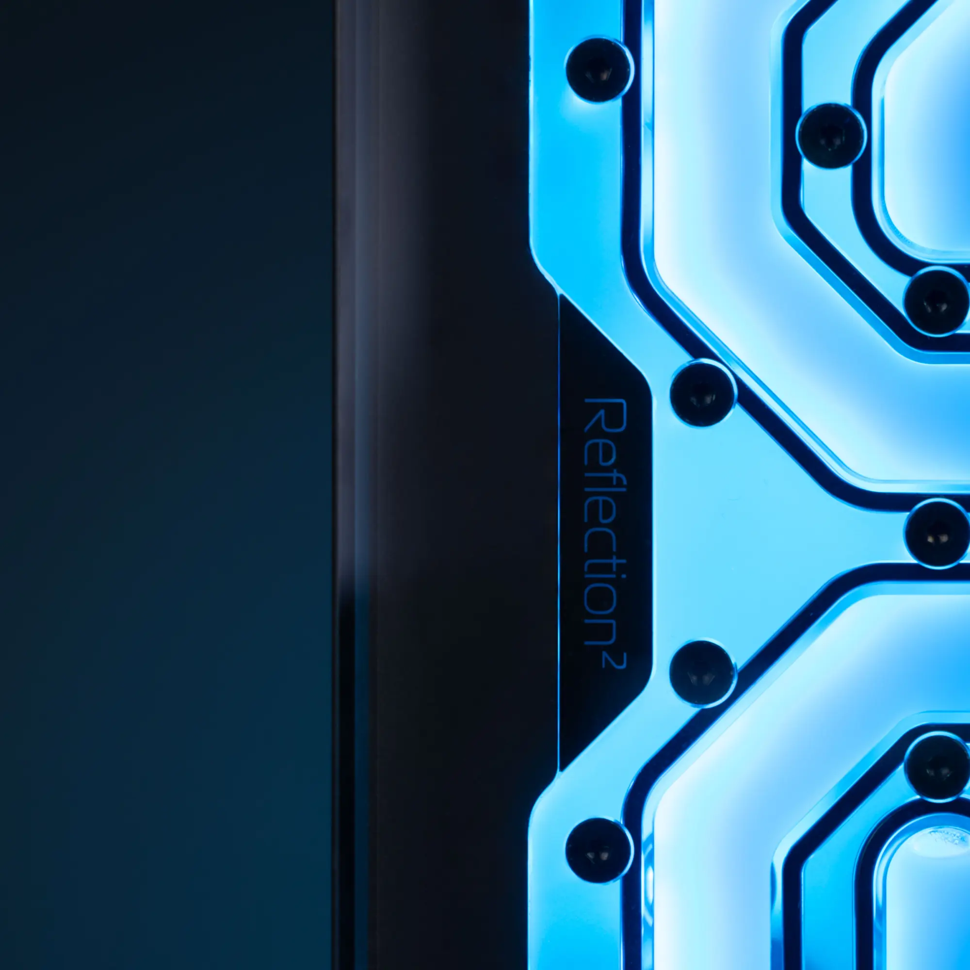 Особливу увагу привертає організація внутрішнього простору: розподільні пластини з яскравим підсвічуванням, ідеально прокладені прозорі трубки СВО і масивні радіатори створюють відчуття інженерної досконалості. Синхронізоване RGB-підсвічування дає глибоке блакитне світло, яке розсіюється по всій системі і підкреслює кожну деталь конструкції. Ефект підсилюється акуратним укладанням кабелів в кольоровій оплетці — інтер'єр корпусу виглядає максимально чисто і стильно.