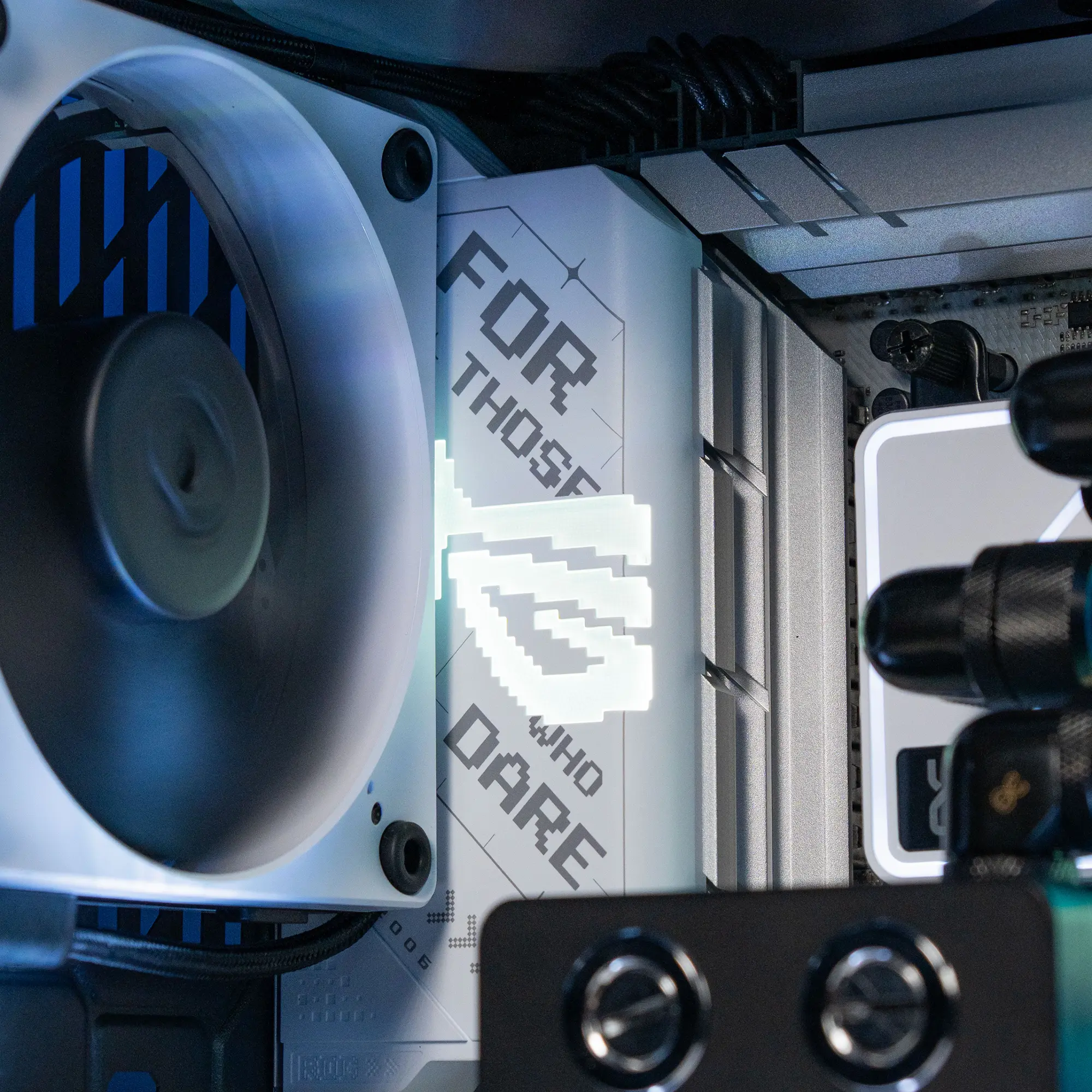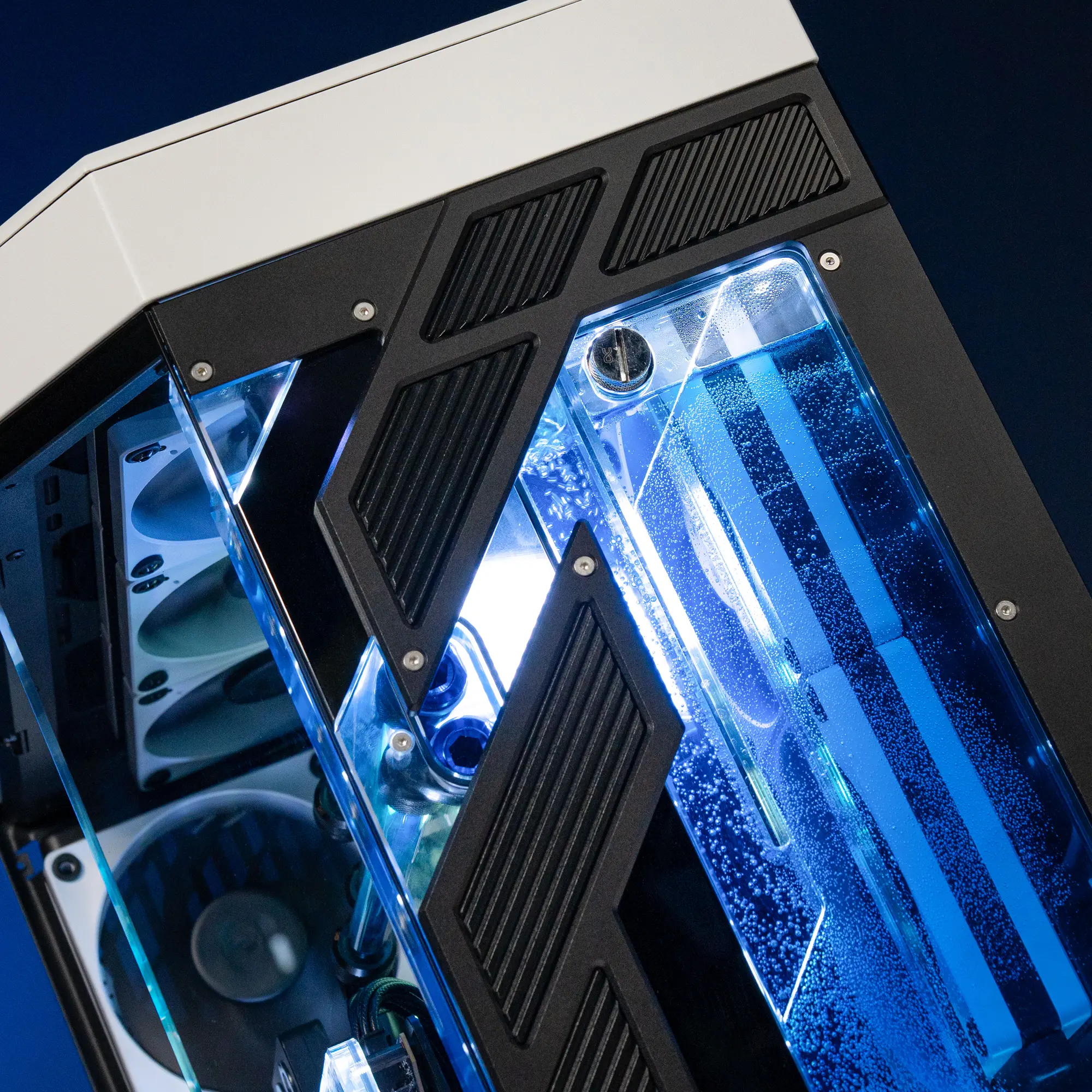Особливу увагу привертає дистроплейт на передній панелі і блакитне підсвічування, завдяки якому корпус набуває вигляду крижаного моноліту. RGB-вентилятори і продумана внутрішня архітектура підкреслюють динаміку і естетику збірки.