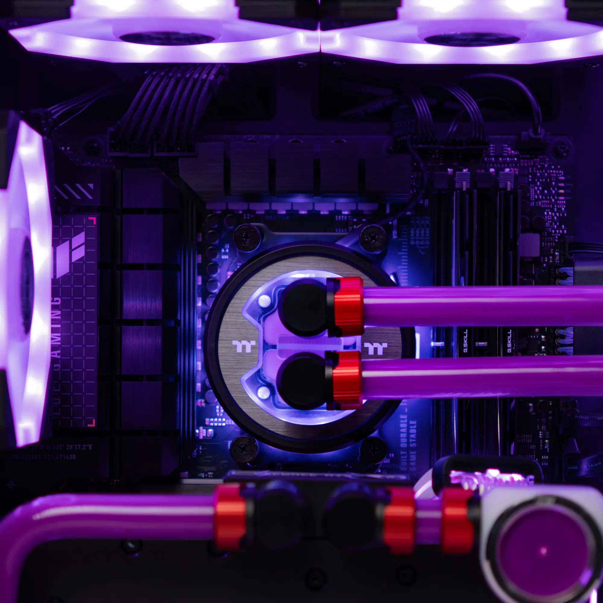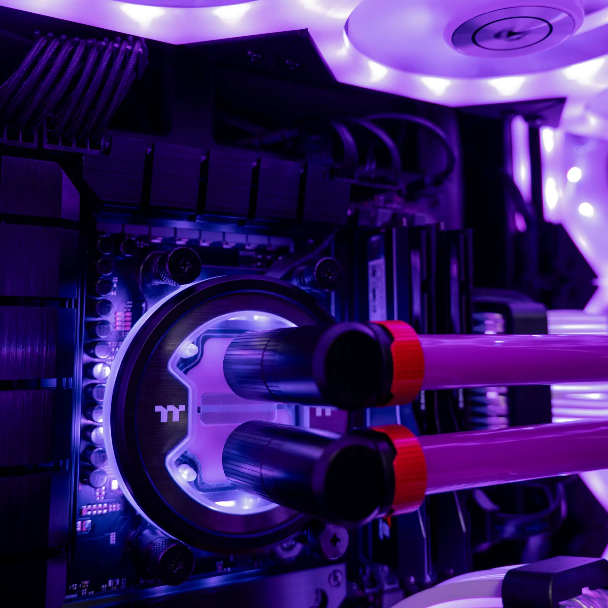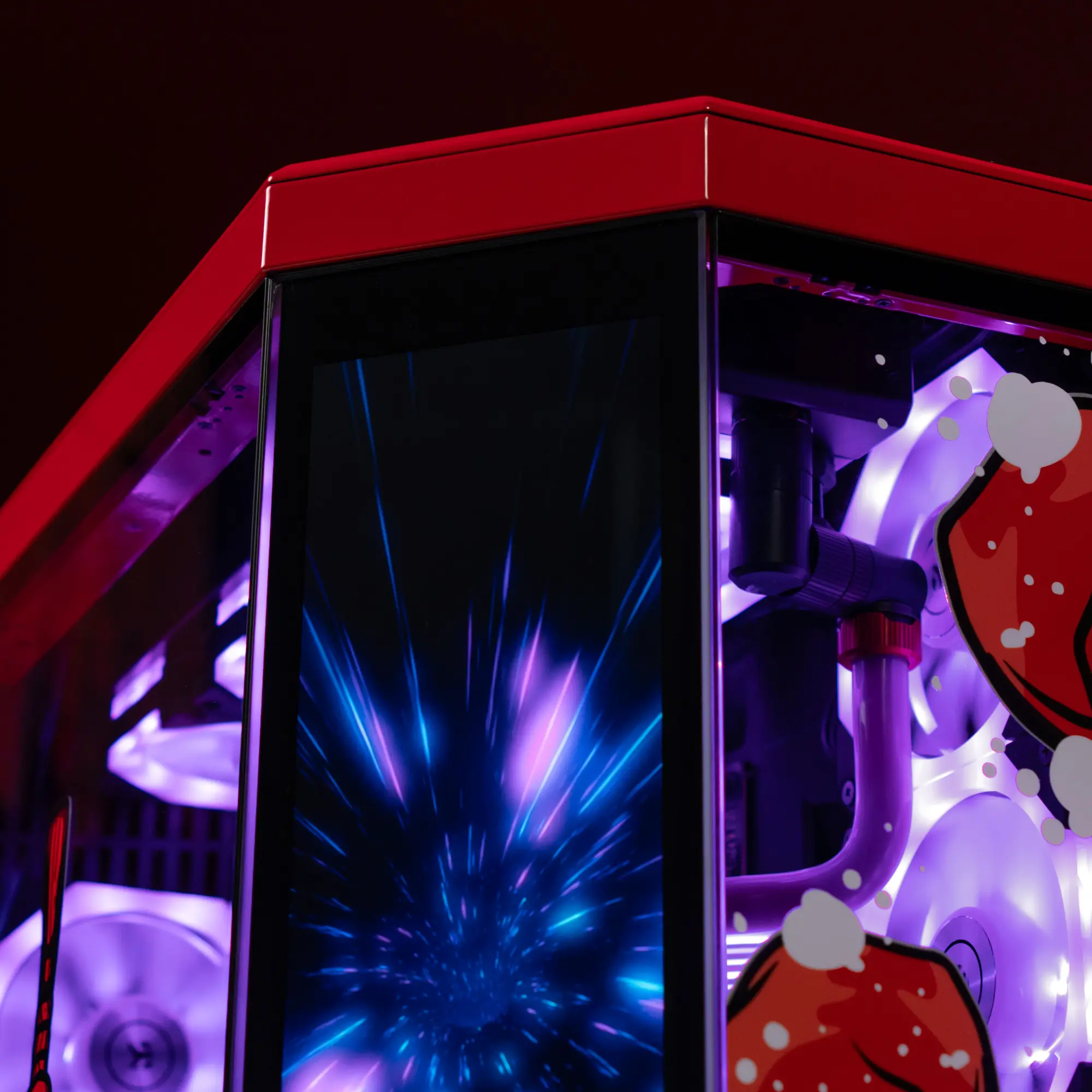 Усередині корпусу продумана не тільки естетика, але і функціональність. Кастомна рідинна система охолодження з акриловими трубками і підсвічуванням забезпечує ефективне розсіювання тепла навіть при високих навантаженнях. Кольорове обплетення кабелів підкреслює акуратність збірки і доповнює загальне візуальне рішення. Все це створює ідеальне поєднання продуктивності та естетики.