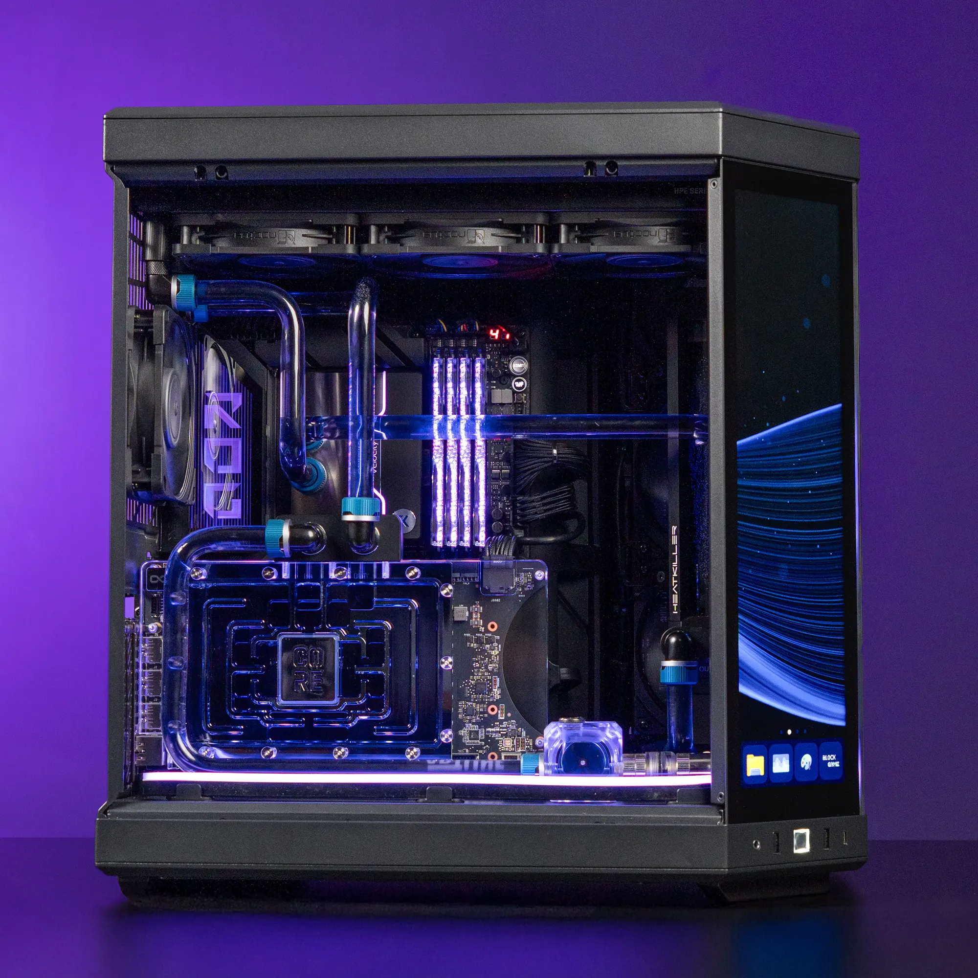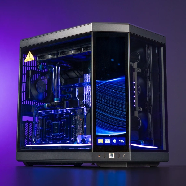 Комп'ютер ARTLINE HYTE Y70 Silent Flow — це поєднання потужності, витонченого дизайну та преміальної тиші. В основі — корпус HYTE Y70 формату Middle Tower, доповнений кастомною системою рідинного охолодження з ідеально вивіреними акриловими трубками. Фіолетові акценти і м'яке синє RGB-підсвічування надають системі елегантності, а світлодіодні стрічки і підсвічувана помпа створюють ефект технологічного арт-об'єкта.
