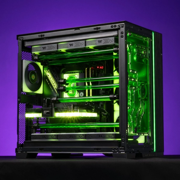 ARTLINE Lian Li O11D Green Light — це не просто комп’ютер, а втілення передових технологій та естетики. Зібраний у корпусі O11 Dynamic, цей ПК є поєднанням функціональності та стилю, де кожна деталь продумана до дрібниць. Легендарний корпус дозволяє виділити ключові елементи системи, створюючи унікальний візуальний акцент. На фоні чорних компонентів насичено-зелений охолоджувач, що циркулює по трубках, перетворює цей комп’ютер на справжній «зелений ліхтар», який стане центром уваги у вашому ігровому просторі.