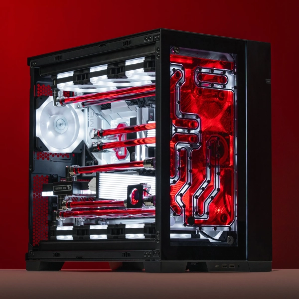 ARTLINE Lian Li O11D Horizon — це вражаюча кастомна збірка, в якій естетика та інженерна точність поєднуються в єдину концепцію. Панорамний корпус із двокамерною архітектурою дозволяє повністю розкрити внутрішнє компонування, роблячи систему не просто потужним інструментом, а справжнім візуальним об’єктом. Основну увагу тут привертає складна геометрія кастомного водяного контуру, виконаного з використанням жорстких трубок, по яких циркулює насичено-червона рідина, створюючи виразний і динамічний образ.