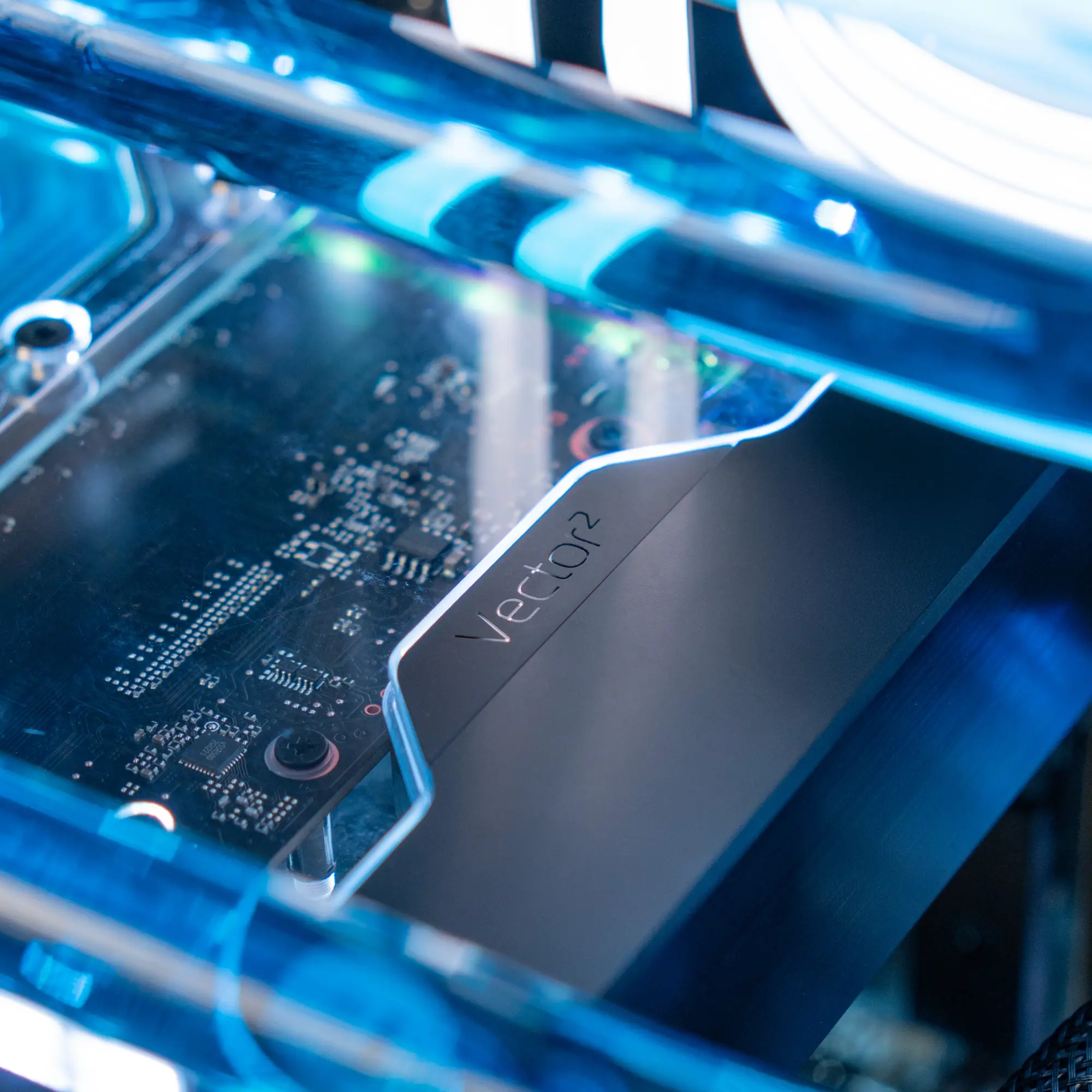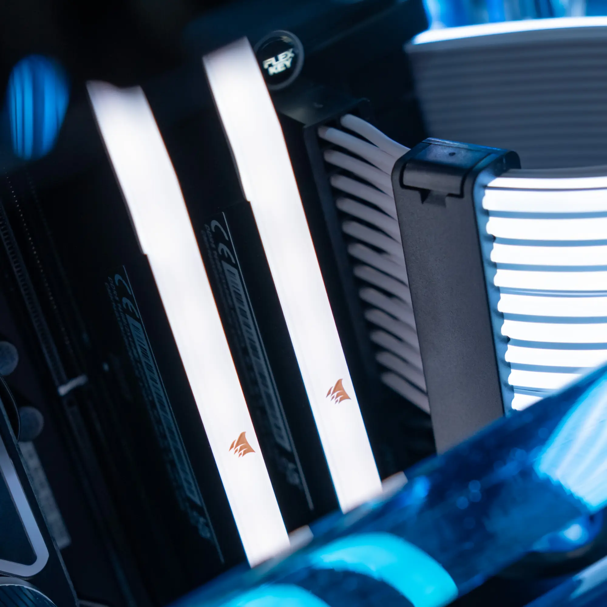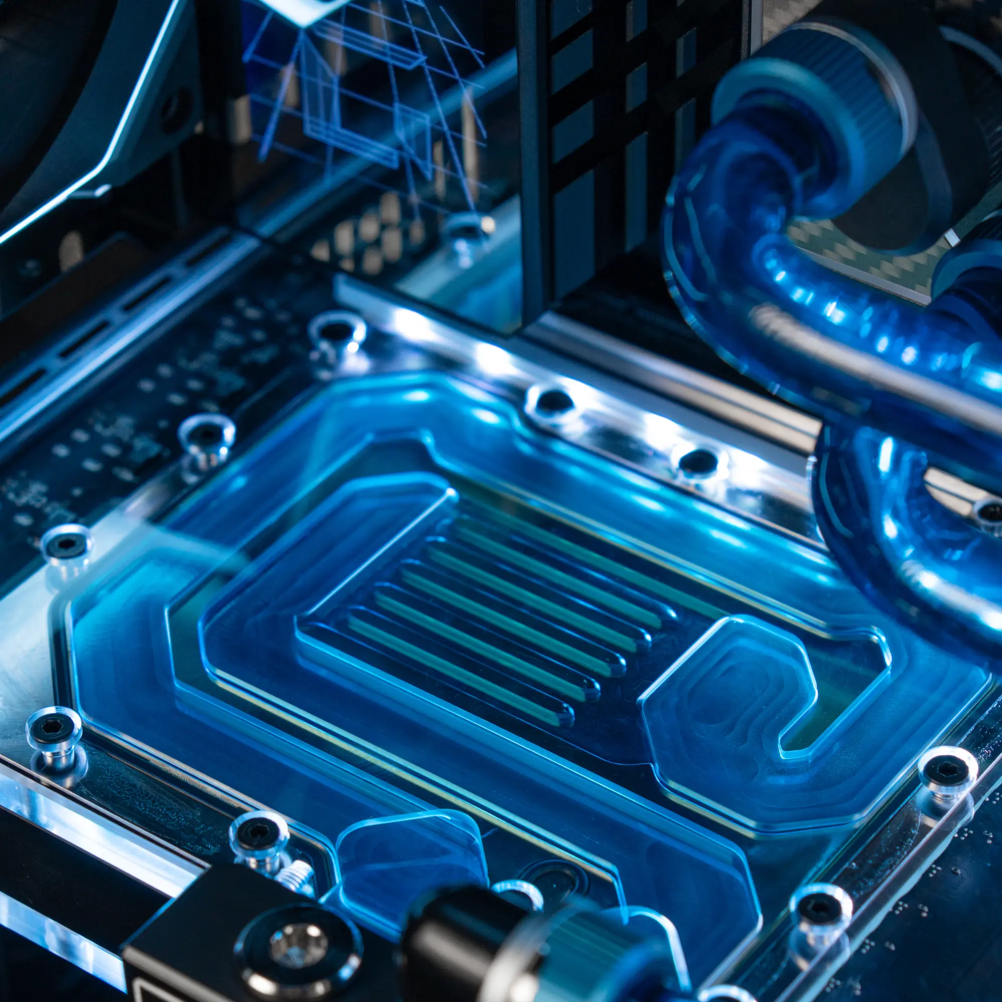 Серце обладнання — кастомна система рідинного охолодження, встановлена з точністю і дбайливістю. Всі трубки, фітинги і резервуари гармонійно вписані в «морозну» тему, працюючи тихо, стабільно і симетрично. У цій установці краса ліній важливіша за кричущі ефекти.