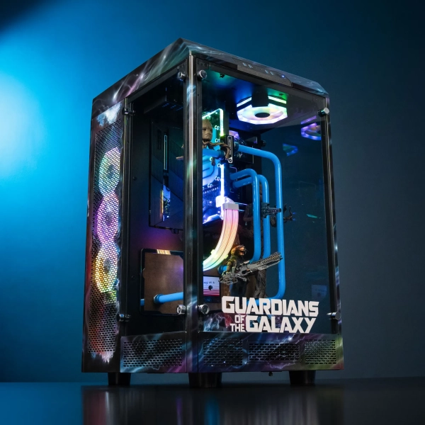 ARTLINE Tower 900 Guardians — це унікальний витвір мистецтва у світі персональних комп'ютерів, що поєднує в собі високу продуктивність і естетичну виразність. Цей ПК, виконаний у масивному корпусі-вітрині, являє собою не просто обчислювальну машину, а справжній технологічний шедевр, здатний вразити навіть найвимогливіших користувачів. Основну увагу привертає кастомний контур рідинного охолодження, який забезпечує оптимальну температуру для ключових компонентів, таких як процесор і відеокарта. Рідина насиченого бірюзового кольору, що циркулює по системі, створює захопливий візуальний ефект, ідеально гармоніюючи з фігурками Вартових Галактики — надихаючих захисників всесвіту.