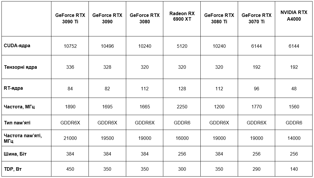 Порівняння GeForce RTX 3090 Ti зі схожими до неї відеокартами: