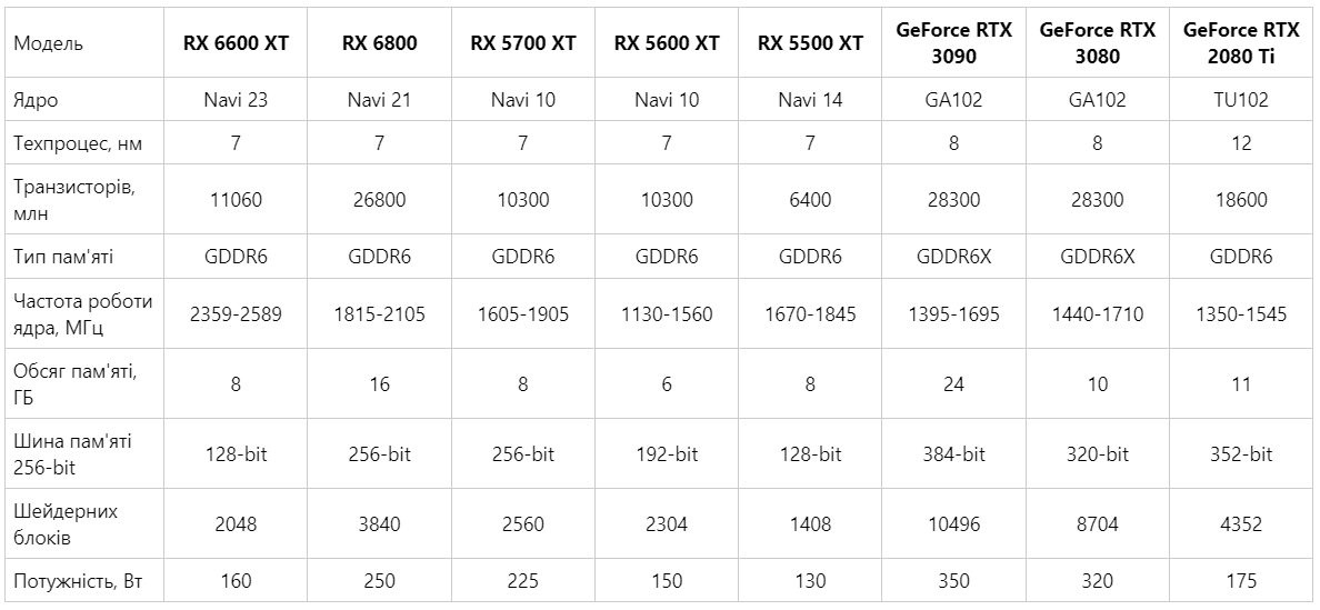 Для того, щоб ви наочно змогли порівняти відеокарту AMD Radeon RX 6600 XT і з її аналогами та конкурентами, ми пропонуємо ознайомитися з таблицею нижче. У ній вказані основні характеристики, що безпосередньо впливають на продуктивність моделей і їх результативність в задачах, пов'язаних з обробкою графіки.