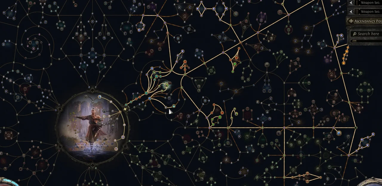 Почнемо з нодів на Ascendancy – від розвіяних вітром, до фріз білда і зверху беремо дух. За рахунок скіла на дух, духу у нас буде стільки, що повірити важко. Це прекрасно, адже в шмотках ми ніде не будемо його шукати, а, як ми знаємо, шмотки з духом завжди йдуть дорожче. Після по дереву беремо багато ближніх скілів: на енергощит, на фріз білд, на кріти й інші дрібниці. Кріти забираємо по дорозі зверху, а після беремо підвищення демеджу, демедж + акурасі, і вверху знову кріти. На лінії далі важливо взяти скіл на бонус до енергощита за спритність в тушці. Треба нарулити до 3к енергощита, щоб почуватись комфортно. Від’їжджаємо назад і йдемо вниз, де беремо атак демедж і акурасі. Недалеко беремо енергощит за шапку. Так як наш основний скіл – це скіл ближнього бою, себто мілі скіл, вкачуємо такий спис. Справа беремо скіл на відновлення мани – це обов’язково, беремо кріт і скіли на посох, де вище теж кріт. Як бачте, скіли вкачувати обов’язково не всі, беремо лише ті, що я. Намазка на амулет – Stormcharged.