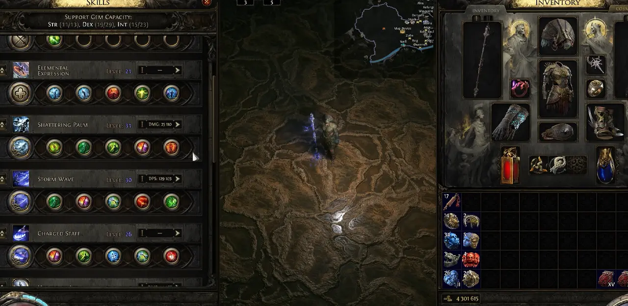 Далі перейдемо до наших скілів, головними з котрих є Shattering Palm, Storm Wave, Charged Staff і Hand of Chayula. Shattering Palm – це саме той скіл, який дозволяє стрибати по головах. Шторм Wave ми будемо юзати як допоміжний скіл для зачистки карти, адже іноді краще не стрибати в натовп, а просто його змести. Charged Staff -це зарядка нашого посоха Power Chargam’и, котрі будуть генеритись за рахунок скіла Hand of Chayula зі спеціальним каменем Ailiths Chimes, без котрого цей білд не буде працювати. Наголошую: щоб цей білд працював, вам треба купити за пару екзів цей новий камінь Ailiths Chimes і вставити його в скіл Hand of Chayula.
