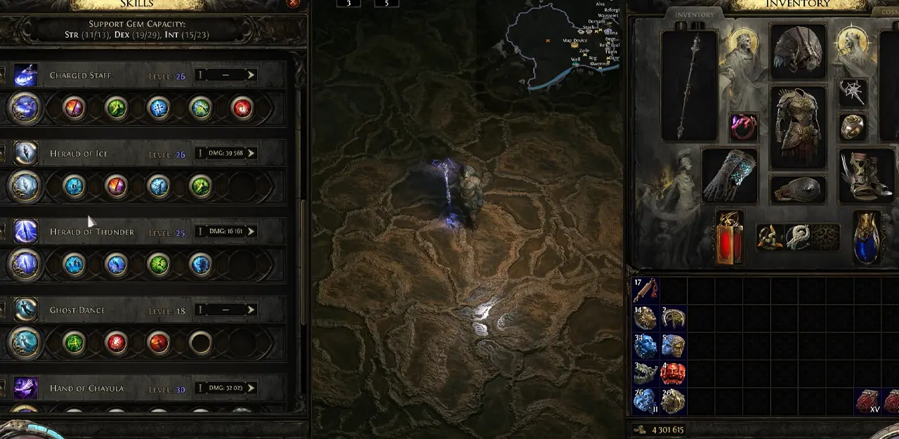 Далі теж є декілька хитрих маніпуляцій. Щоб білд працював, треба в Hand of Chayula і Shattered Palm вставити камінь підтримки під назвою Culmination 2. Коли ви його вставите, ви побачите, що ці скіли тепер мають лічильники. Чим більше кріпів вбиваємо, тим більше число назбирується. Нам треба назбирати від 10 зарядів на Hand of Chayula, після чого заюзати цей скіл чи на кріпа, чи просто в повітря, а після протиснути Charged Staff, щоб зарядити посох Power Chargam`и. Заряджений посох додає біля 70к дамага і діє до 20-30 секунд, в залежності які каміння підтримки ви в нього вставили. Це дуже серйозний буст, тим паче якщо скіл Hand of Chayula направити на кріпа чи боса, він дає снайперську мітку, що ще потужніше дамажить вашого опонента. Цього разу я не буду озвучувати всі каміння, ви можете побачити їх на екрані, або побачити в текстовому варіанті на нашому сайті – посилання я залишу в описі цього відео. Є в нас і допоміжні аури: грім і холод. Є аура на ухилення wind dancer + аура ghost dancer, яка відновлює енергощит в бійці. Скіл Falling Thunder теж юзається з каменем Кульмінація і теж набирає заряди. Це чисто one shot-скіл на босів – ви набиваєте до 30-40 зарядів і даєте 1 удар, після чого падає все. Також наше піднесення дає нам додатковий скіл Elemental Expression, в котрий теж будемо вставляти каміння, але цей скіл сам відкриває для цього дірки згідно з вашим лвлом. Щоб отримати всі п’ять, вкачайтесь до 90-го.