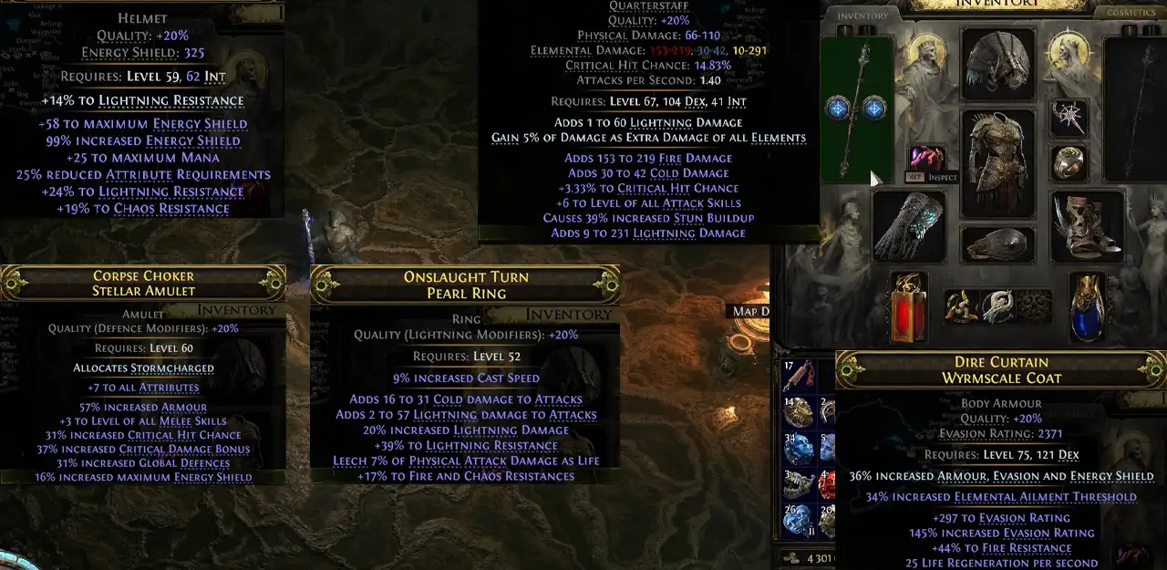 Тепер по шмоту. В шмотках ми будемо шукати ухилення, енергощит і резісти. Купити крутий посох – найбільш важлива річ. Надважливо брати посох з кріт шансом як мінімум в 14%, в іншому випадку кріти на білді працювати не будуть. Дивимось на такі параметри: adds to вогонь, холод, блискавка – бити ми будемо одразу трьома стихіями. Беремо +6 до рівня атакувальних скілів. Такий посох як в мене – це максимум, що ви можете взяти до 10 діванів – може сьогодні вже й дорожче, бо економіка завжди йде вперед. В руни вставляємо + до лайтнін демедж.