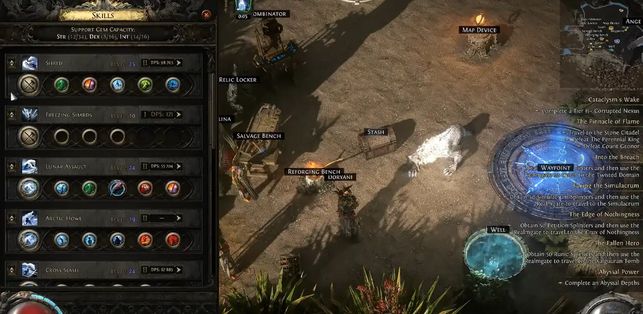 Вся суть цього білда – заморозити противника. Ми будемо йти в фріз immobilized buildup, який дозволяє заморожувати суперників, а після наносити їм дуже, дуже багато дамагу. Це наша головна фішка і працює вона як на картах, так і на босах. Наша основна атака називається Shred і є постійним скілом, який не потребує прокачки, так як наносить він фізичний дамаг. Сюди вставляємо: rapid attacks 2 для швидкості атаки, elemental armament 2 для демеджа, cold attunement 2 і close combat 2 теж для дамага, а також crescendo 2 для добивань і швидкості атаки.
