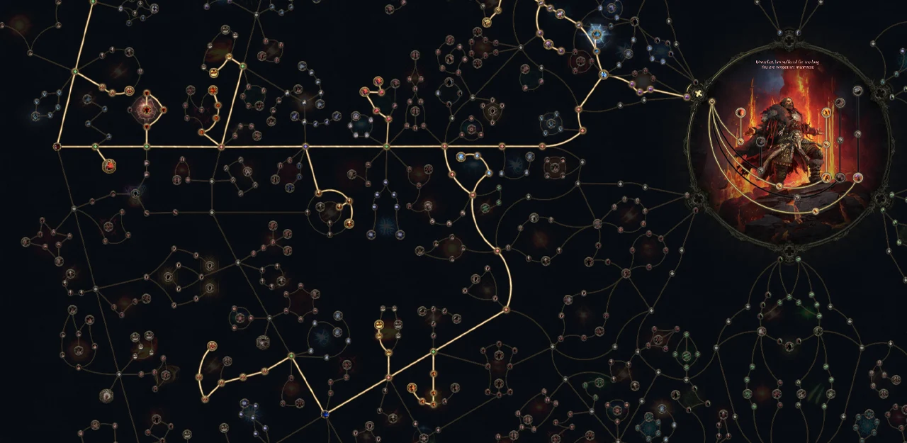 Спочатку йдемо в дамаг, беремо скіл на дамаг по площі, це важливо. Нам вкрай необхідна броня і енергощит, тому такі ноди теж будемо брати там, де можна. Тут гілочка на скіл спід – теж важливий стат для нас. Вкачуємо цю рогатку і бачимо ноди на immobilization – це і є наша заморозка, наш головний стат в цьому білді. Вкачуємо всі ноди з ним, щоб морозити противників так, як дівчата морозили тебе в школі. Йдемо нижче, беремо стати, вкачуємо три скіла на довготривалість скілів загалом – завдяки цим скілам наш Lunar Blessing буде тривати 20 секунд разом з тими каміннями, про котрі я казав. Йдемо нижче, щоб взяти буст дамага – Талісман наш пушка двуручна, тому половина цього якоря нам канає. Далі беремо дамаг і скіл спід, беремо дамаг по площі, а після надважливі ноди на Rage – обов’язково вкачати. Щоб Lunar Blessing тривав довго, йдемо вверх і вкачуємо скіли на warcry cooldown. Такі ж скіли беремо й нижче біля якоря. Там ж далі кров з носа берем ноди на immobilization. Рухаємось далі по вищій гілці і вкачуємо відсоток броні, і після беремо нодик на відсутність мани – всі скіли тепер будуть жерти нам ХП. Цей нод рекомендую брати вже в самому кінці на 90 лвлі, бо до того я грав з маною і все було ок, та потім для максимального посилення ману доведеться офнути.