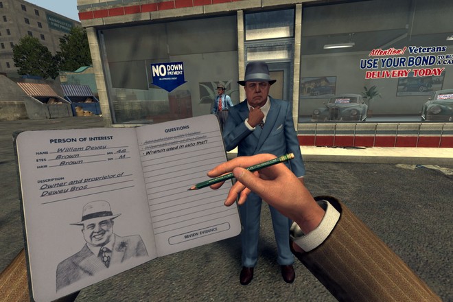 Постановка в цій грі (не дивлячись на те, що вийшла вона в 2011 році) знаходиться на високому рівні. Величезна кількість красивих великих планів, динамічна камера і чудове музичний супровід перетворюють її в справжній голлівудський онікс, цінність якого важко перебільшити. Помітити найменше вам дозволять допити – центральна фішка цієї гри. Щоб вибудувати логічний ланцюжок подій, вам потрібно буде ретельно досліджувати місце вбивства, шукаючи найменші приводи для реплік. Якщо ви не знайдете той, чи інший доказ, ви втратите можливість вивести персонажа на чисту воду, втрачаючи метод і підхід. Вибирати докази ви можете в своєму блокноті – Rockstar продовжила свою любов до деталей, демонструючи не тільки розлогу методику, а й красиві замальовки, які можна побачити і в Red Redemption 2 в щоденнику Артура Моргана. Допит відбувається дуже динамічно. У плані вибору ви можете повірити оповідачеві, засумніватися в його словах, або й взагалі звинуватити. На прийняття правильного рішення впливає міміка допитуваних – тут починається центральне надбання L.A. Noire. Справа в тому, що гра одна з перших використовувала технології сканування реальних осіб.