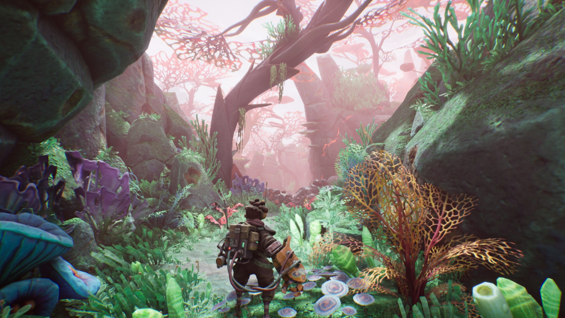 Перше, про що варто поговорити, це чудовий візуальний стиль цієї гри. The Gunk рясніє пейзажами, змушуючи не відпускати палець з кнопки скріншота. Тутешню подорож можна назвати медитативною, адже гра не має агресивного характеру. Вона більше орієнтована на юну публіку - чудовий варіант для гри під час різдвяних свят. Витончений художній стиль The Gunk майстерно створює незабутню атмосферу. У грі витає "аромат" невідомості, незвідана планета повністю відповідає своїй таємничості - що, якщо тут досі існує розумне життя? Це питання проект ставить після двох годин геймплею, підігріваючи градус інтриги. Його підвищенню сприяють і футуристичні будівлі, які ми знайдемо по мірі проходження. Хто ж тут мешкав і як зникла місцева цивілізація? Відповіді на загадки пропонуємо дізнатися особисто.