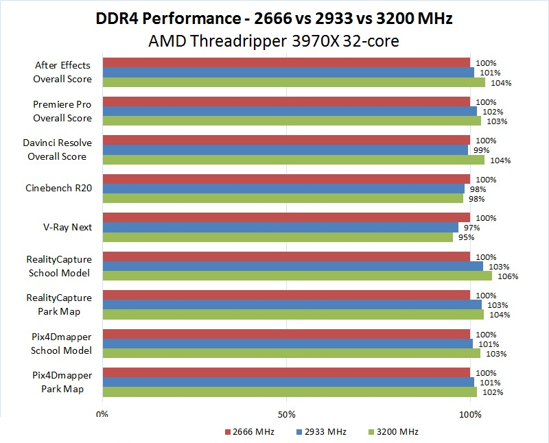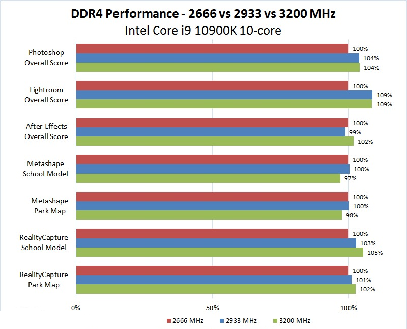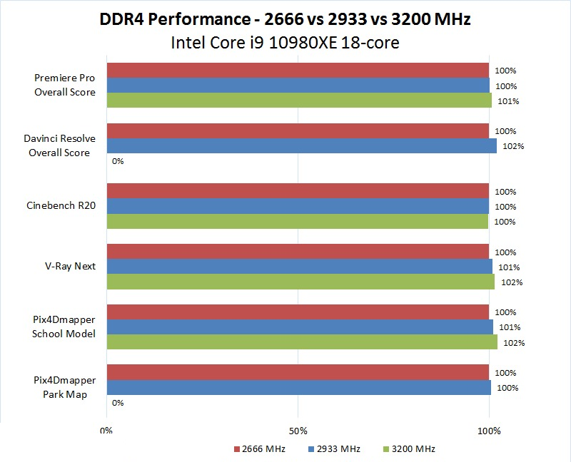 - Intel i9 10980XE не працював стабільно з пам'яттю 3200 МГц, так як це значення перевищує офіційну підтримувану швидкість 2933 МГц. Зокрема, йому не вдалося пройти тести Davinci Resolve або Pix4D Park Map, тому за цими двома результатами на графіку показано 0%.