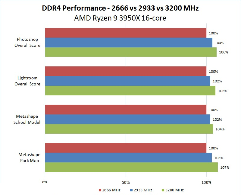 Через такого підходу деякі процесори були протестовані з більшою кількістю додатків, ніж інші. Дані розбиті на діаграму для кожного процесора, і результати показані як продуктивність щодо найнижчої швидкості пам'яті (2666 МГц). Червона лінія - результат 2666 МГц, який за визначенням завжди буде на рівні 100%, синя лінія показує 2933 МГц, а зелена - 3200 МГц. Чим вище відсотки, тим краще.
