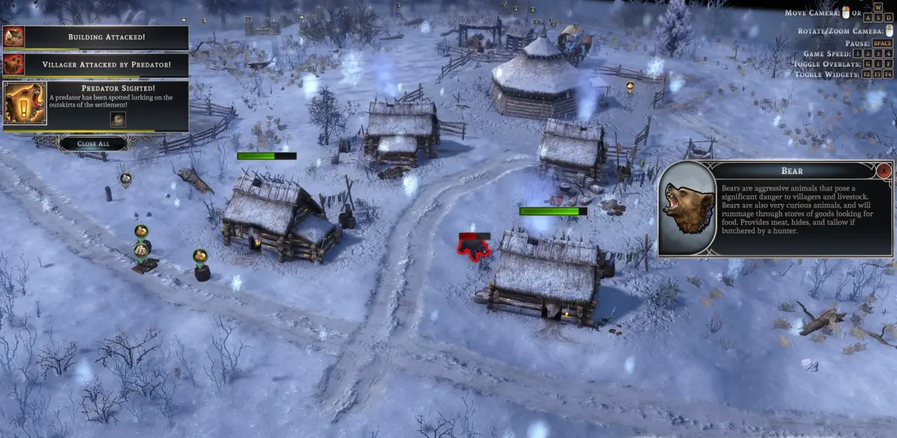 Та всі ці наскочники тут – лише часова умовність, гра нагадує тобі, що ти спізнюєшся з розвитком, тому він може або застрягнути, або й взагалі припинитись. Коли бачиш, що в певний момент село перестає розвиватись, значить ти щось зробив чи робиш не так. Все ж тут є проблема з робочими зонами, є проблема з постійним переміщенням робочих зон будівель, є проблема зі штучним інтелектом і надмірно тендітними стратегіями розвитку, такими вузькими, як псяча стежка. Розумієш це за декілька днів, коли прекрасний музичний супровід перетворюється на композицію, котра вже на нервах грає – мене ці мотивчики скрипки вже в снах переслідують, не можна більше подібної музики до гри завезти замість двох треків по 5 хвилин?