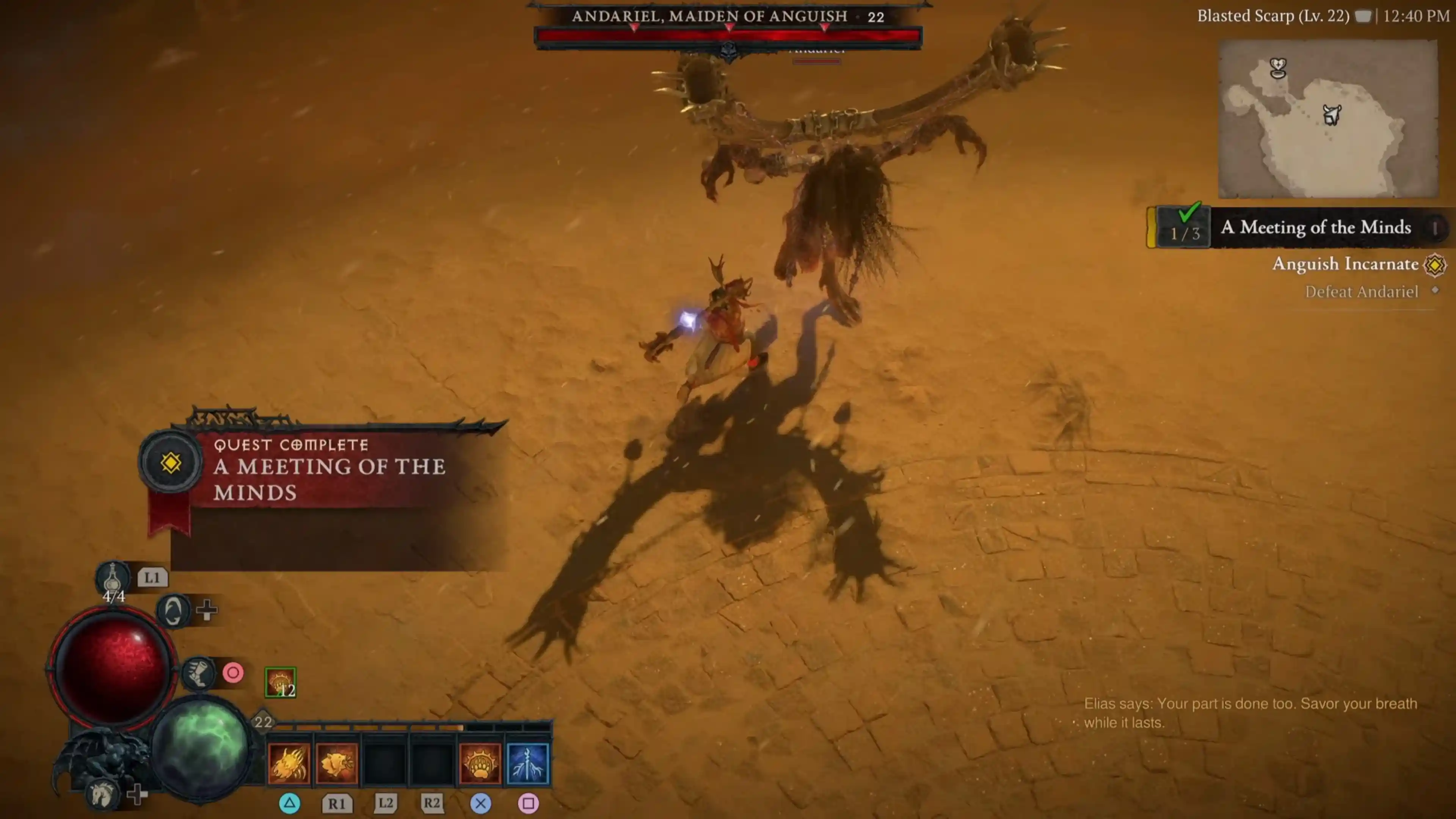 У видіннях, котрі ми бачили, фігурував лисий маг, який і прикликав Ліліт до цього світу. Про нього ми розповіли Лорату, а той з’ясував, що це Еліас, його колишній учень і хорадрім, який пішов іншим шляхом. Еліас, як і інші, по-своєму тлумачив пророцтво Ратми. Він вважав, що тільки Ліліт зможе врятувати цей світ від інших сил і переродити його в крові. Ми починаємо шукати Еліаса всюди, ну а згодом виходимо на його слід. Ми відправляємось до його лабораторії, вбиваємо його підданого і демона-захисника, розпорюємо живіт демону і за залишками людських тіл дізнаємось приблизне місцезнаходження Еліаса. Ми відправляємось до міста Гулран, в якому проводять парад геноциду місцеві канібали під керівництвом Еліаса і його прислужників. Там дізнаємось, що той хоче прикликати до цього світу Мале втілення зла – Андарієль. Біжимо до місця, де проводиться ритуал, і рятуємо дівчину-жертву Таїсу. Сам Еліас отримує ножом, але, чомусь, не помирає, ну а ми втікаємо з місця кривавої церемонії. На жаль, ритуал частково зачепив Таїсу і та чує шепіт Андарієль в своїй голові. Лорат відводить дівчину до Храму, де шепіт стає тихішим, ну а ми відправляємось по дупу Еліаса через піщану бурю за наводкою агентів Лората. Подолавши бурю, ми попадаємо до великого палацу, в котрому з боєм прориваємось до Еліаса, щоб забрати в нього таємничий артефакт Незряче око, який дозволить нам спостерігати за діяннями Ліліт і дізнаватись її місцезнаходження. Ми вбиваємо Еліаса, але він знову відроджується. Вбиваємо ще декілька разів і розуміємо, що цей покидьок володіє безсмертям. Разом з Лоратом наш герой хапає артефакт і втікає через потаємний хід.