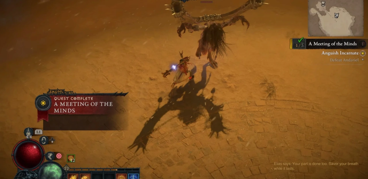 У видіннях, котрі ми бачили, фігурував лисий маг, який і прикликав Ліліт до цього світу. Про нього ми розповіли Лорату, а той з’ясував, що це Еліас, його колишній учень і хорадрім, який пішов іншим шляхом. Еліас, як і інші, по-своєму тлумачив пророцтво Ратми. Він вважав, що тільки Ліліт зможе врятувати цей світ від інших сил і переродити його в крові. Ми починаємо шукати Еліаса всюди, ну а згодом виходимо на його слід. Ми відправляємось до його лабораторії, вбиваємо його підданого і демона-захисника, розпорюємо живіт демону і за залишками людських тіл дізнаємось приблизне місцезнаходження Еліаса. Ми відправляємось до міста Гулран, в якому проводять парад геноциду місцеві канібали під керівництвом Еліаса і його прислужників. Там дізнаємось, що той хоче прикликати до цього світу Мале втілення зла – Андарієль. Біжимо до місця, де проводиться ритуал, і рятуємо дівчину-жертву Таїсу. Сам Еліас отримує ножом, але, чомусь, не помирає, ну а ми втікаємо з місця кривавої церемонії. На жаль, ритуал частково зачепив Таїсу і та чує шепіт Андарієль в своїй голові. Лорат відводить дівчину до Храму, де шепіт стає тихішим, ну а ми відправляємось по дупу Еліаса через піщану бурю за наводкою агентів Лората. Подолавши бурю, ми попадаємо до великого палацу, в котрому з боєм прориваємось до Еліаса, щоб забрати в нього таємничий артефакт Незряче око, який дозволить нам спостерігати за діяннями Ліліт і дізнаватись її місцезнаходження. Ми вбиваємо Еліаса, але він знову відроджується. Вбиваємо ще декілька разів і розуміємо, що цей покидьок володіє безсмертям. Разом з Лоратом наш герой хапає артефакт і втікає через потаємний хід.