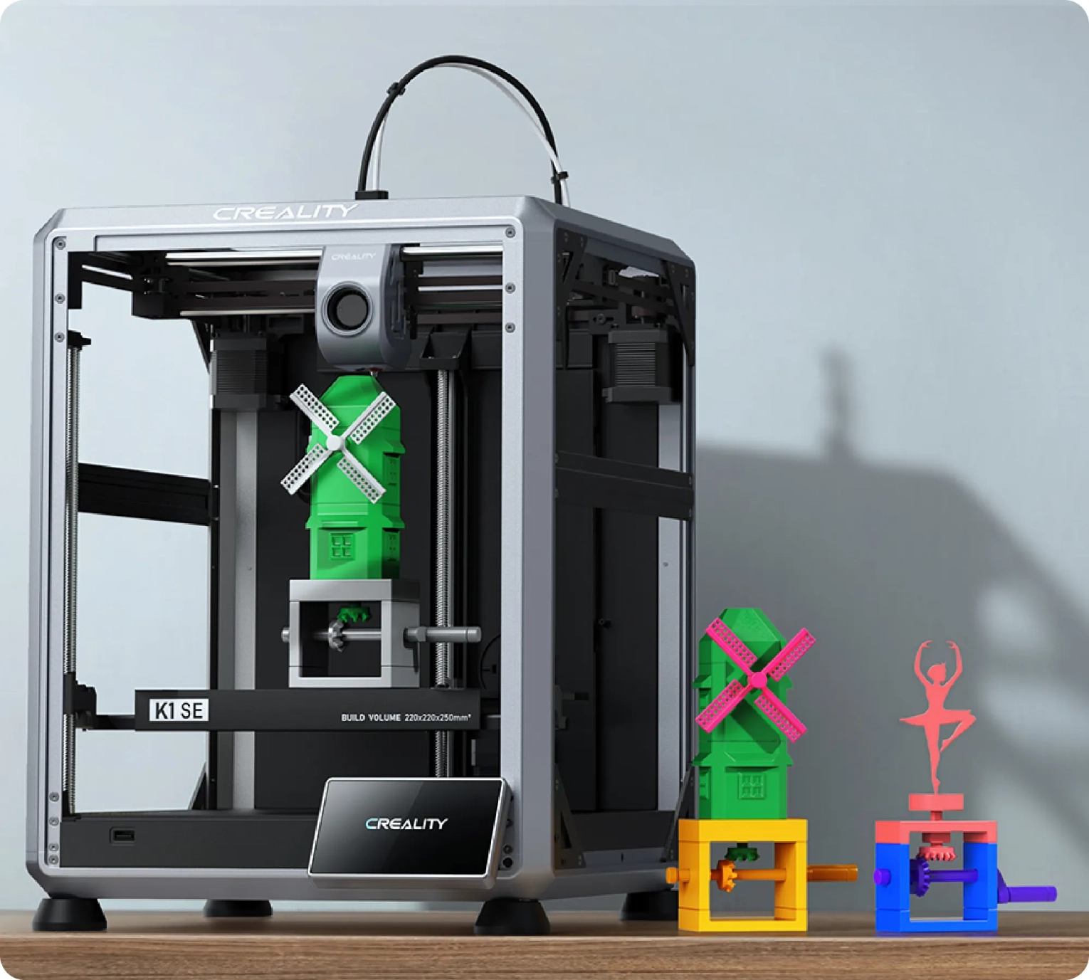 Creality K1 SE є передовим 3D-принтером, який поєднує в собі високу швидкість, точність і зручність використання, роблячи його ідеальним вибором для широкого кола користувачів. Ця модель має робочий об'єм 220х220х250 мм, що дозволяє друкувати безліч різних виробів від невеликих фігурок до великих технічних компонентів. Особливо вражає швидкість друку до 600 мм/с, що значно скорочує час створення моделей. Додатково принтер гарантує виняткову точність друку до 100±0,1 мм, що забезпечує отримання виробів з гладкою поверхнею та високим рівнем деталізації.