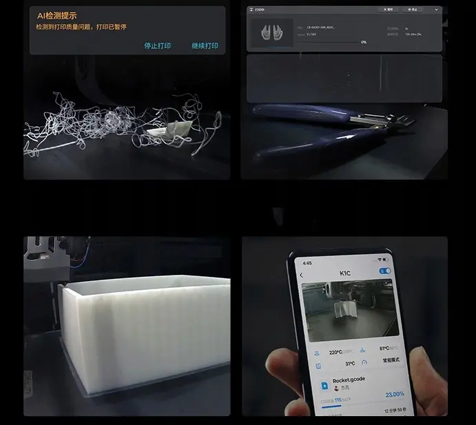 Creality CR-K1C оснащений камерою зі штучним інтелектом. Ця камера дозволяє здійснювати віддалений моніторинг вашого принтера, що робить процес контролю над печаткою ще зручнішим. Камера також виявляє сторонні предмети на платформі, забезпечуючи безпеку та якість друку.