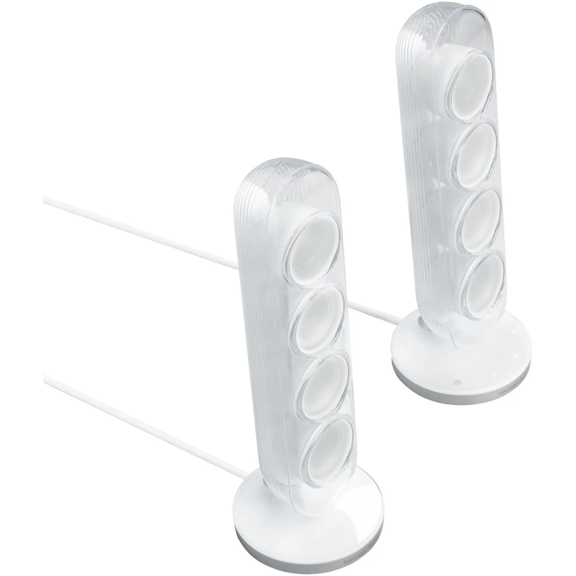 Harman Kardon SoundSticks 5 White — це оновлена версія культової мультимедійної акустичної системи, яка поєднує фірмовий прозорий дизайн і сучасне звучання. Білі акценти корпусу підкреслюють чистоту та легкість стилю, роблячи систему особливо гармонійною у світлих інтер’єрах. Прозорі корпуси сабвуфера й сателітів дозволяють побачити внутрішню конструкцію, створюючи футуристичний та впізнаваний образ, що вже багато років залишається візитівкою лінійки SoundSticks.