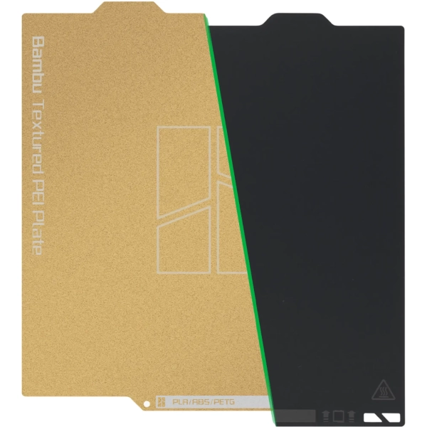 Головна особливість пластини — подвійна робоча поверхня Dual-Texture PEI Plate. Одна сторона виконана з текстурованим PEI-покриттям золотистого кольору, яке забезпечує впевнену адгезію для широкого спектра матеріалів без потреби використовувати додаткові засоби. Така поверхня допомагає моделі надійно утримуватися під час друку та знижує ризик зміщення на перших шарах.
