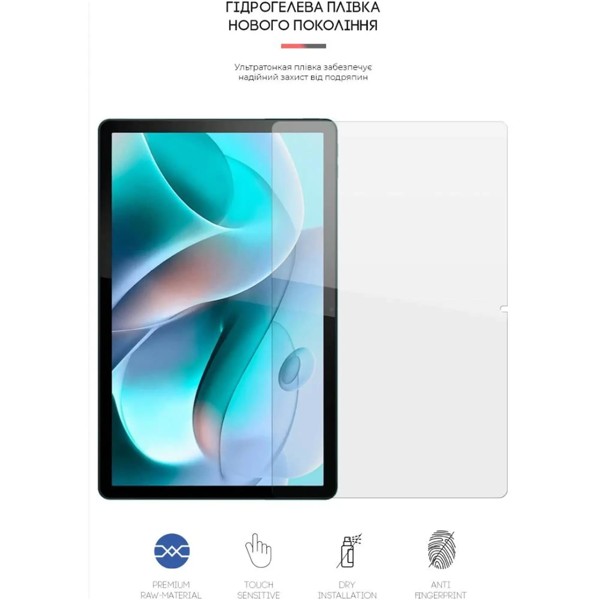 Виготовлена з якісного гідрогелю, плівка відрізняється гнучкістю та стійкістю до механічних впливів. Матеріал має властивості, що самовідновлюються, що дозволяє дрібним подряпинам зникати з часом. Завдяки цьому екран планшета довше зберігає первозданний вигляд. Клейовий шар нанесений по всій поверхні, що унеможливлює появу бульбашок повітря і забезпечує легку установку.
