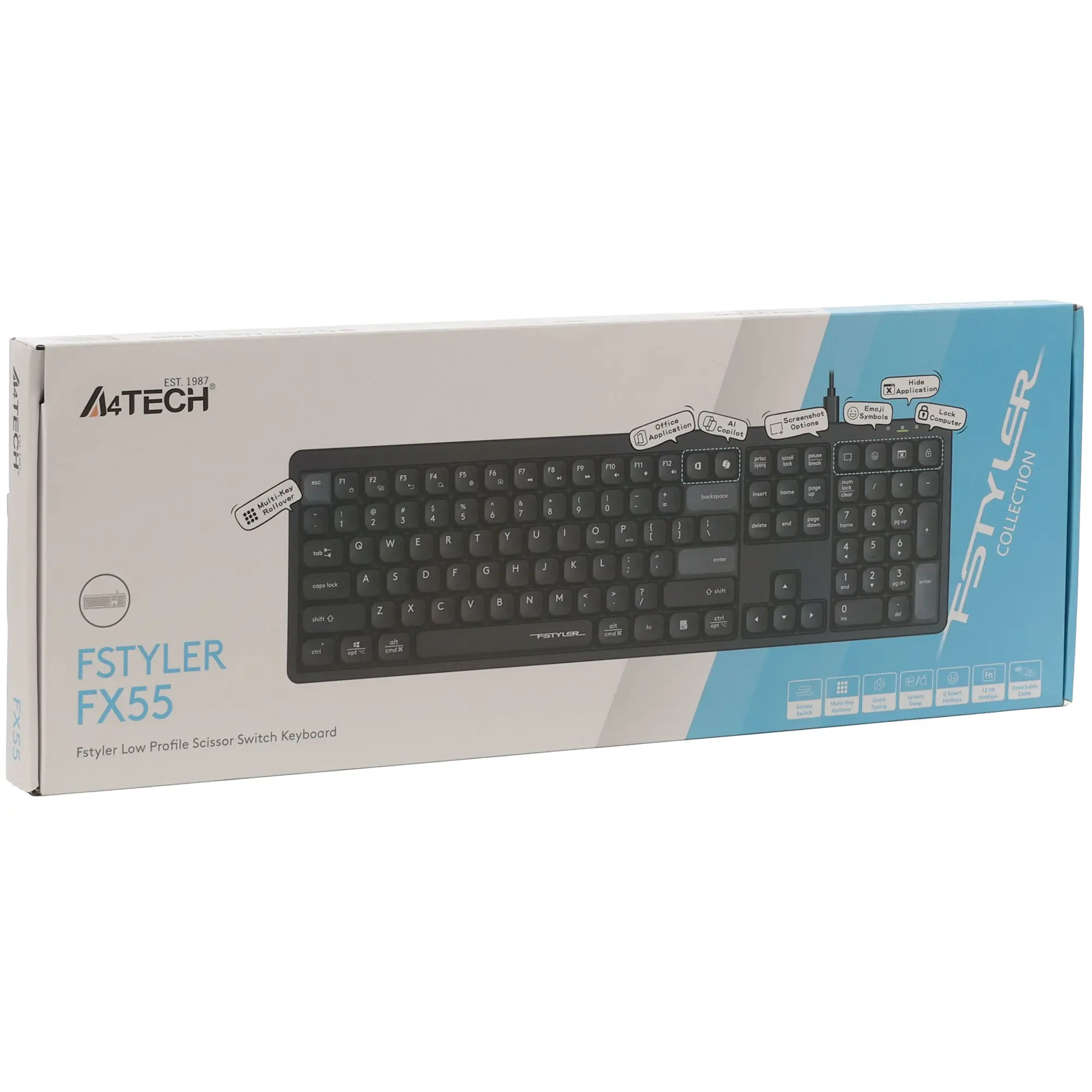 Клавіатура A4Tech Fstyler FX55 Black — це сучасне та функціональне рішення для тих, хто цінує комфорт і точність у повсякденній роботі. Чорний корпус виконаний у мінімалістичному стилі з матовою поверхнею, стійкою до відбитків і зношування. Завдяки продуманій формі клавіатура забезпечує зручне розташування рук, зменшуючи втому під час тривалого друку й підвищуючи продуктивність.