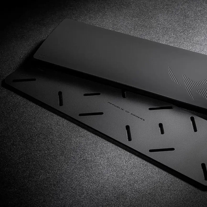 ROG Azoth Extreme вражає своїм дизайном: корпус клавіатури виконаний повністю із алюмінієвого сплаву, а металева рамка прикрашена фірмовим рельєфним візерунком. Нижня панель проходить 12 етапів обробки, включаючи піскоструми, анодування та високоточне ЧПУ-фрезерування, що надає пристрою бездоганний зовнішній вигляд та довговічність.