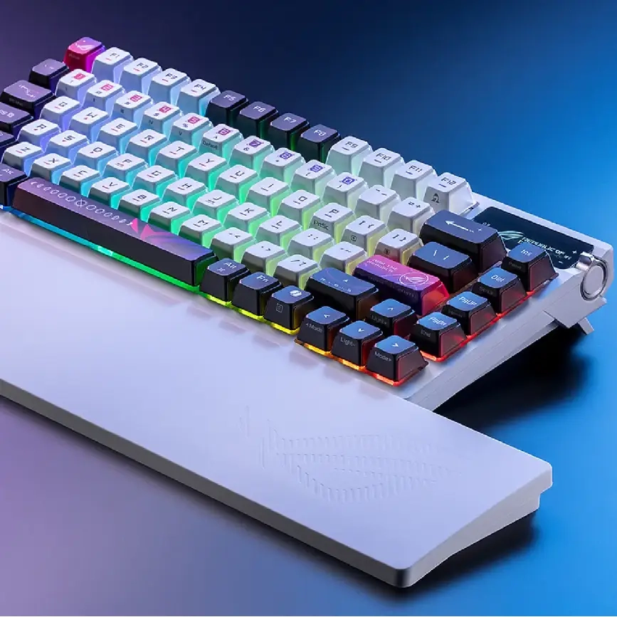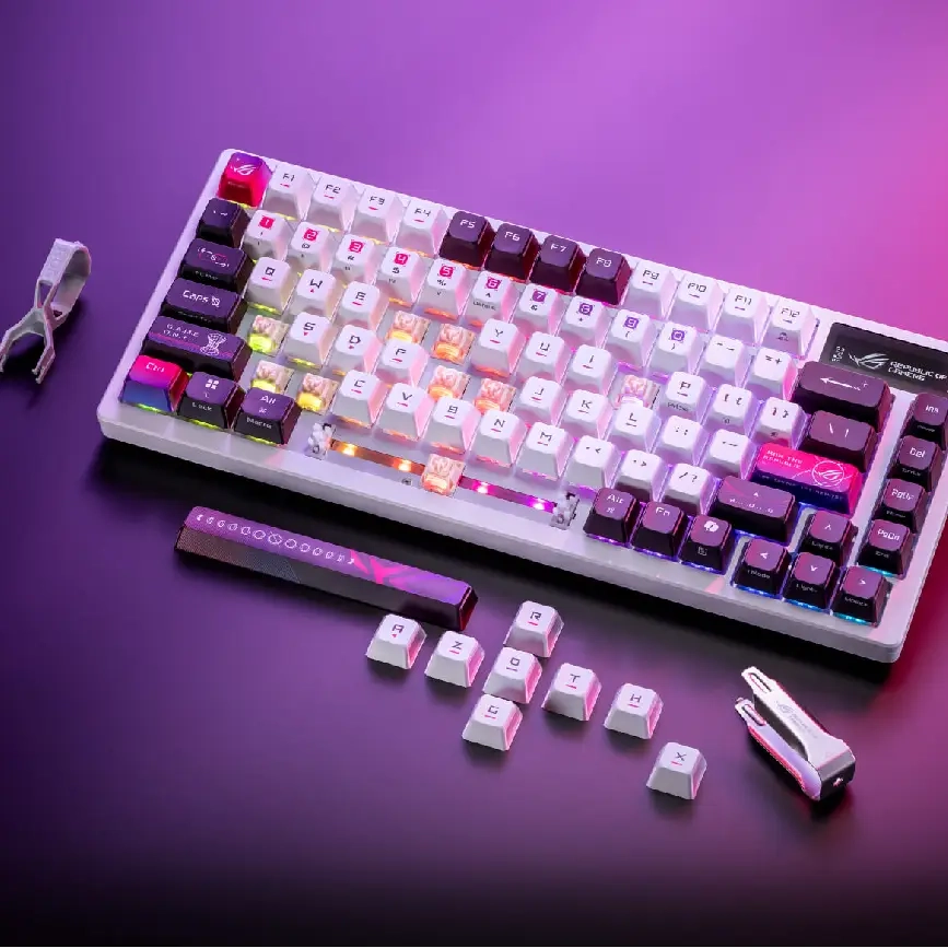 ROG Azoth X - це ігрова клавіатура формату 75%, створена для тих, хто цінує універсальність, точність та можливості персоналізації. Вона оснащена механічними перемикачами ROG NX V2 з підтримкою гарячої заміни та унікальними ковпачками ROG із «зірковим» дизайном. Ковпачки виконані за технологією сублімаційного друку.