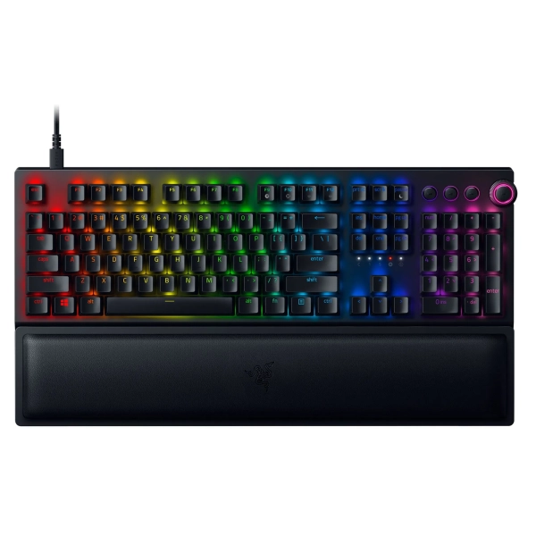 Кожна клавіша оснащена механічним перемикачем Razer Green, який забезпечує чіткий зворотний зв'язок з кожним натисканням, при цьому зберігаючи високу швидкість і точність реакції. Повнорозмірна розкладка клавіатур допомагає комфортно розмістити руки навіть під час тривалих ігрових сесій, а вбудована підставка під зап'ястя підтримує правильне положення рук, знижуючи стомлюваність.