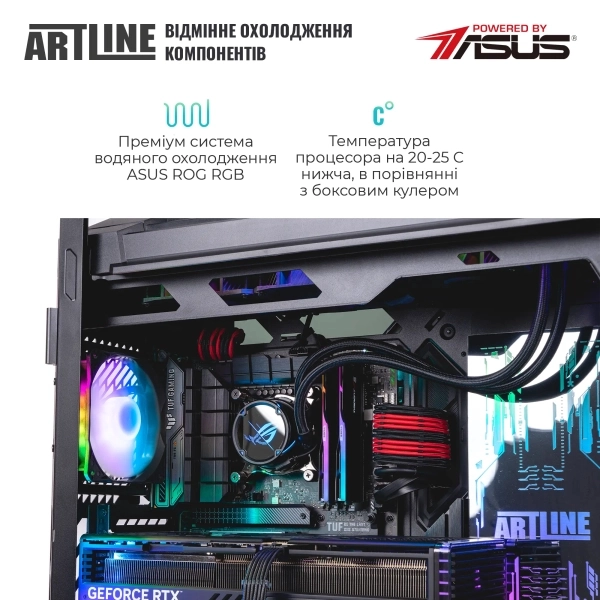 Охолодження процесора довірено системі водяного охолодження ROG STRIX LC 360 RGB, доповненій рядом вентиляторів з RGB підсвічуванням. Любителі ігор та професіонали гідно оцінять 64 ГБ оперативної пам'яті DDR5-6000 Gaming. З такою пам'яттю затримок або "гальм" у роботі просто не існує.
