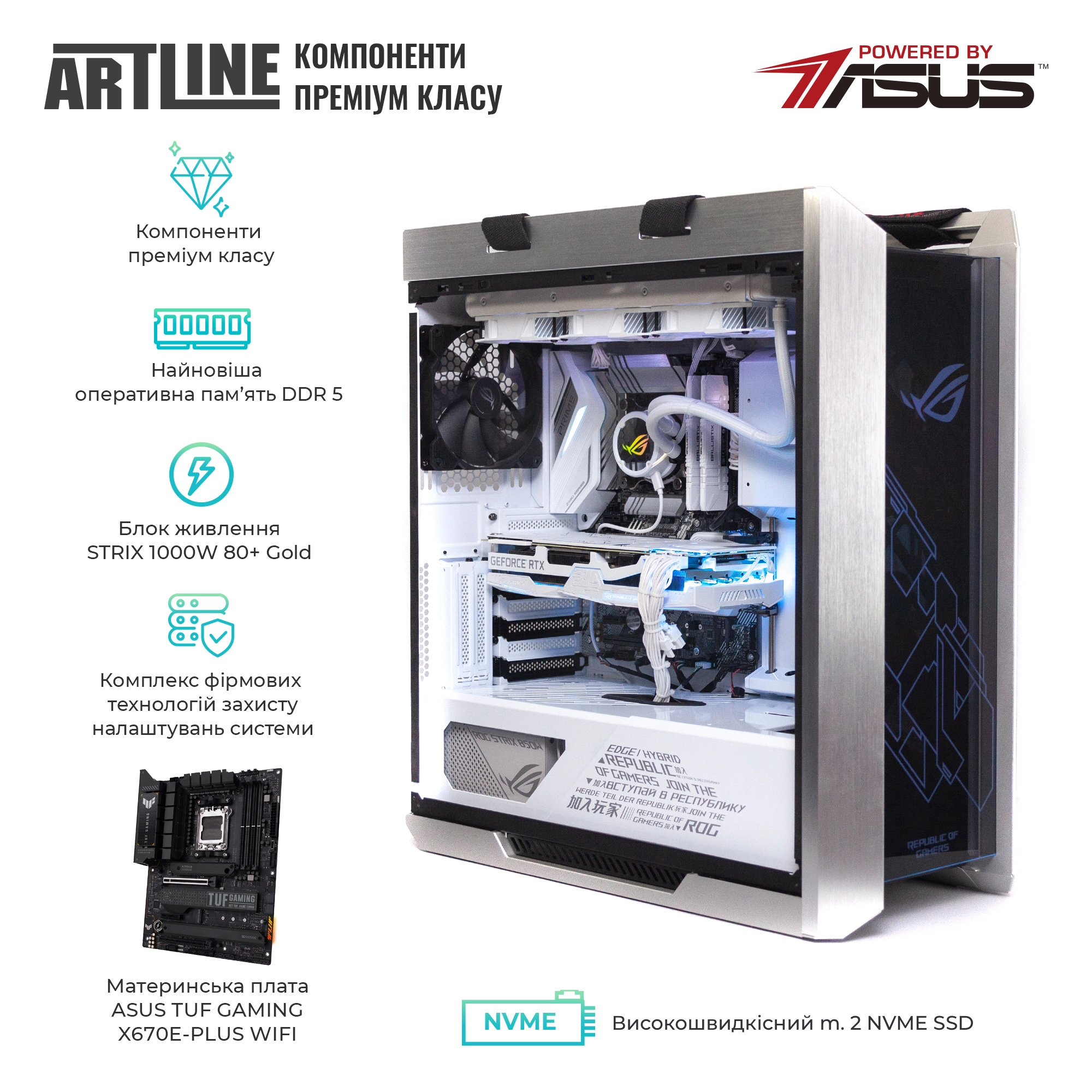 Усі комплектуючі ARTLINE Gaming STRIXv80Winw розміщені у корпусі ASUS ROG STRIX HELIOS White Edition з блоком живлення STRIX на 1000 Вт сертифікації 80+ Gold та комплектом вентиляторів для ефективного охолодження.