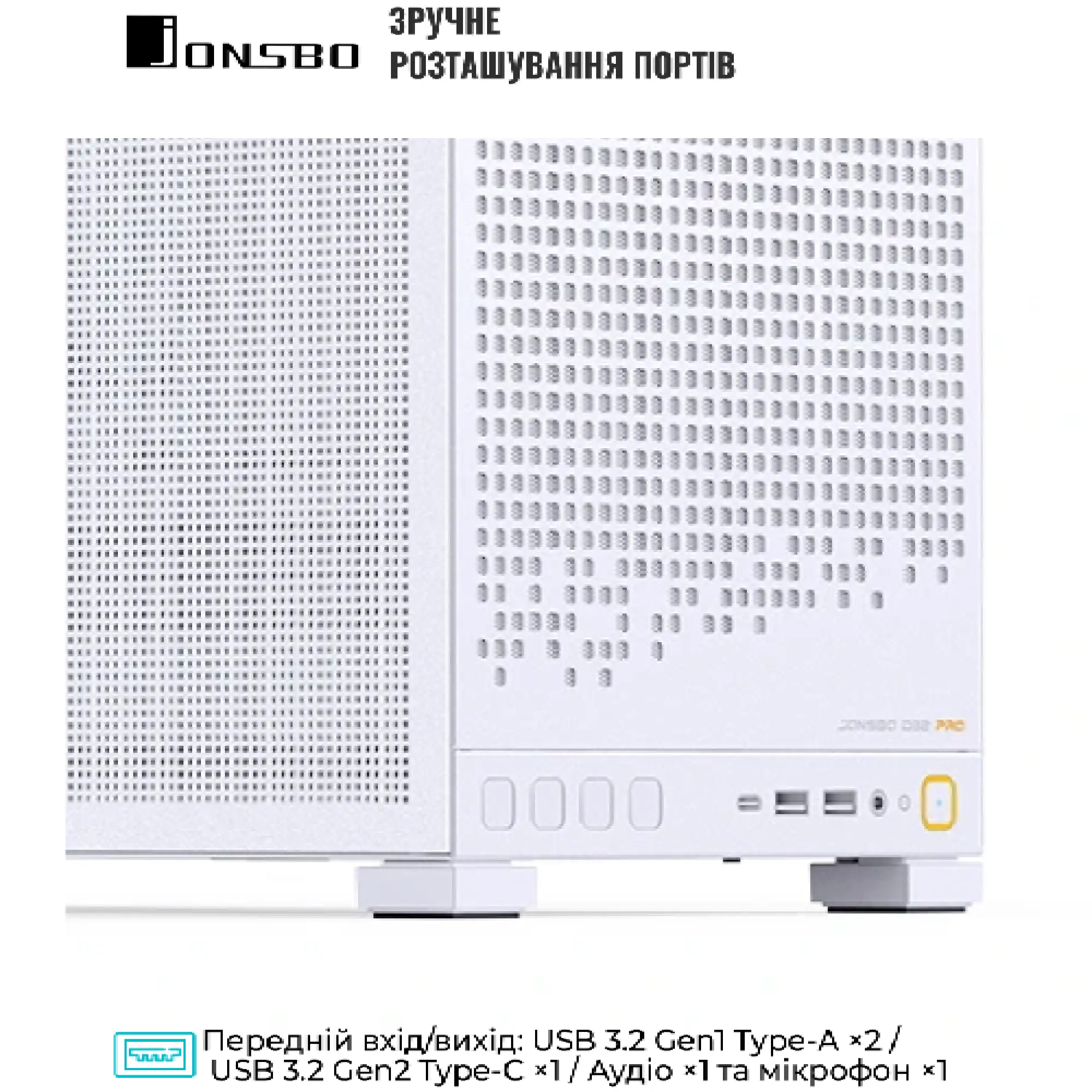 Фронтальна панель обладнана сучасними інтерфейсами: два порти USB 3.2 Gen1 Type-A, один USB 3.2 Gen2 Type-C, а також роз’єми для мікрофона і навушників. При вазі лише 4,3 кг корпус залишається легким і зручним для транспортування. Замовити Jonsbo D32 PRO MESH White в інтернет-магазині Artline можна за привабливою ціною – це чудовий вибір як для компактного ігрового ПК, так і для професійної робочої станції.