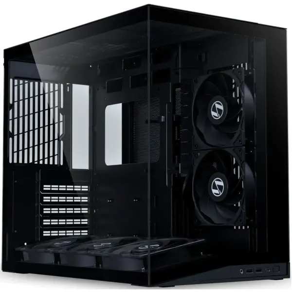 Однією з головних переваг Lian Li O11 Dynamic Mini V2 Flow є потужна вентиляційна база. У корпусі вже встановлено 5 вентиляторів: на бічній панелі розміщено 2 Reverse blade 120 мм PWM, а на нижній панелі — 3 Reverse blade 120 мм PWM. Така схема сприяє стабільному повітряному потоку та допомагає підтримувати оптимальний температурний режим навіть за інтенсивного навантаження. Додатково передбачено 9 місць для встановлення вентиляторів, включно з верхньою, бічною, нижньою та задньою панелями.