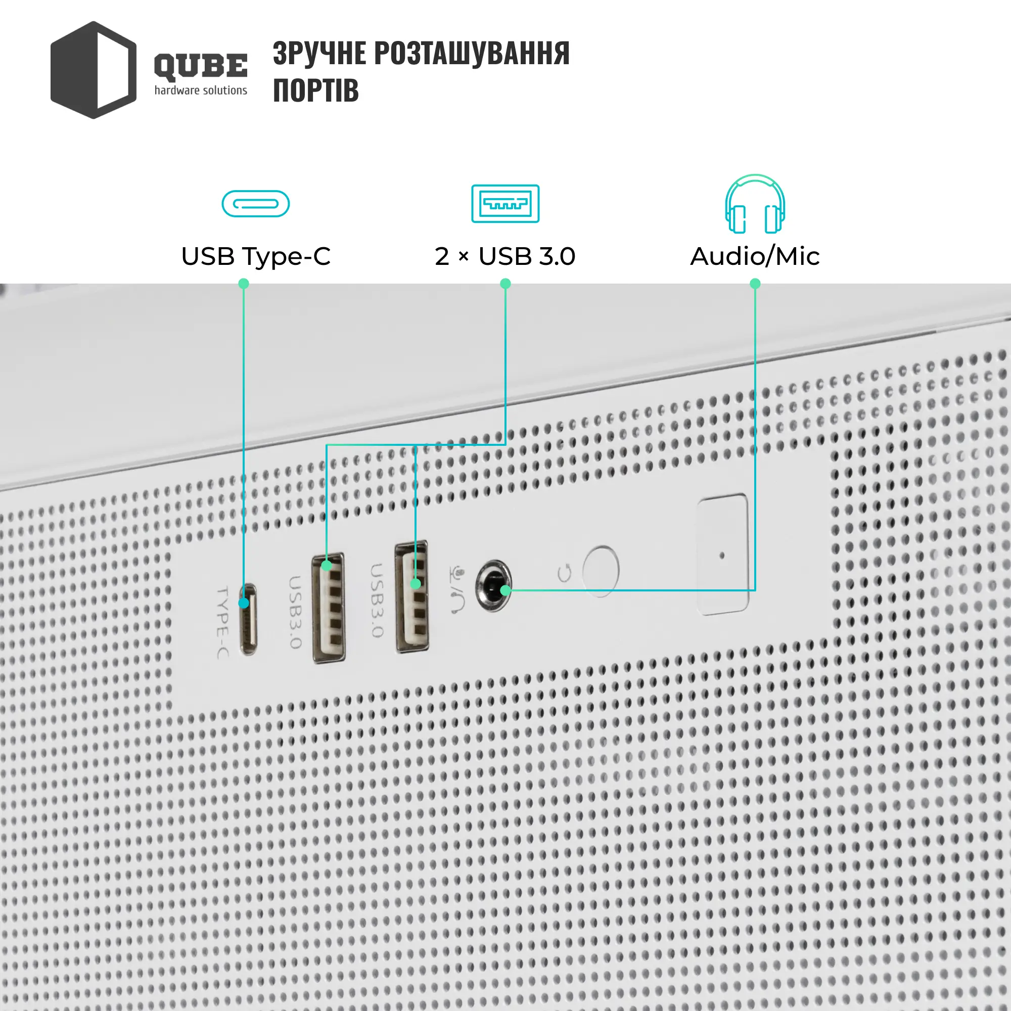 Інтерфейсна панель корпусу обладнана всім необхідним для зручності користувача. Наявність USB 3.0, аудіороз'єму та порту Type-C дає змогу під'єднувати різноманітні пристрої та аксесуари. Внутрішній простір корпусу QUBE MASTERFORCE спроєктовано таким чином, щоб вмістити відеокарти завдовжки до 400 мм і баштові кулери заввишки до 200 мм, що відкриває широкі перспективи для складання потужних конфігурацій. Для зберігання даних передбачено два відсіки для 3.5" HDD і три для 2.5" SSD, забезпечуючи достатньо місця для всіх ваших файлів і програм.
