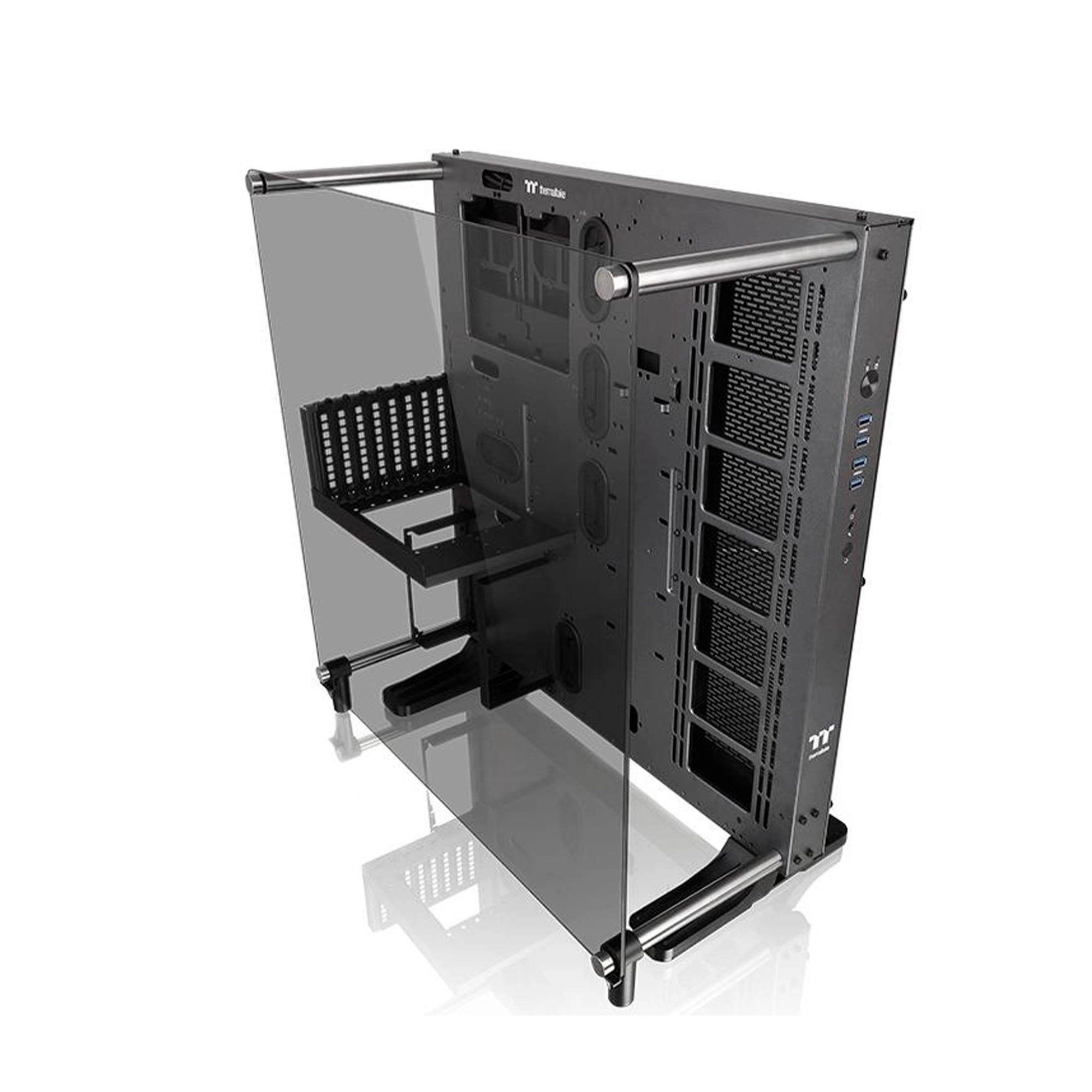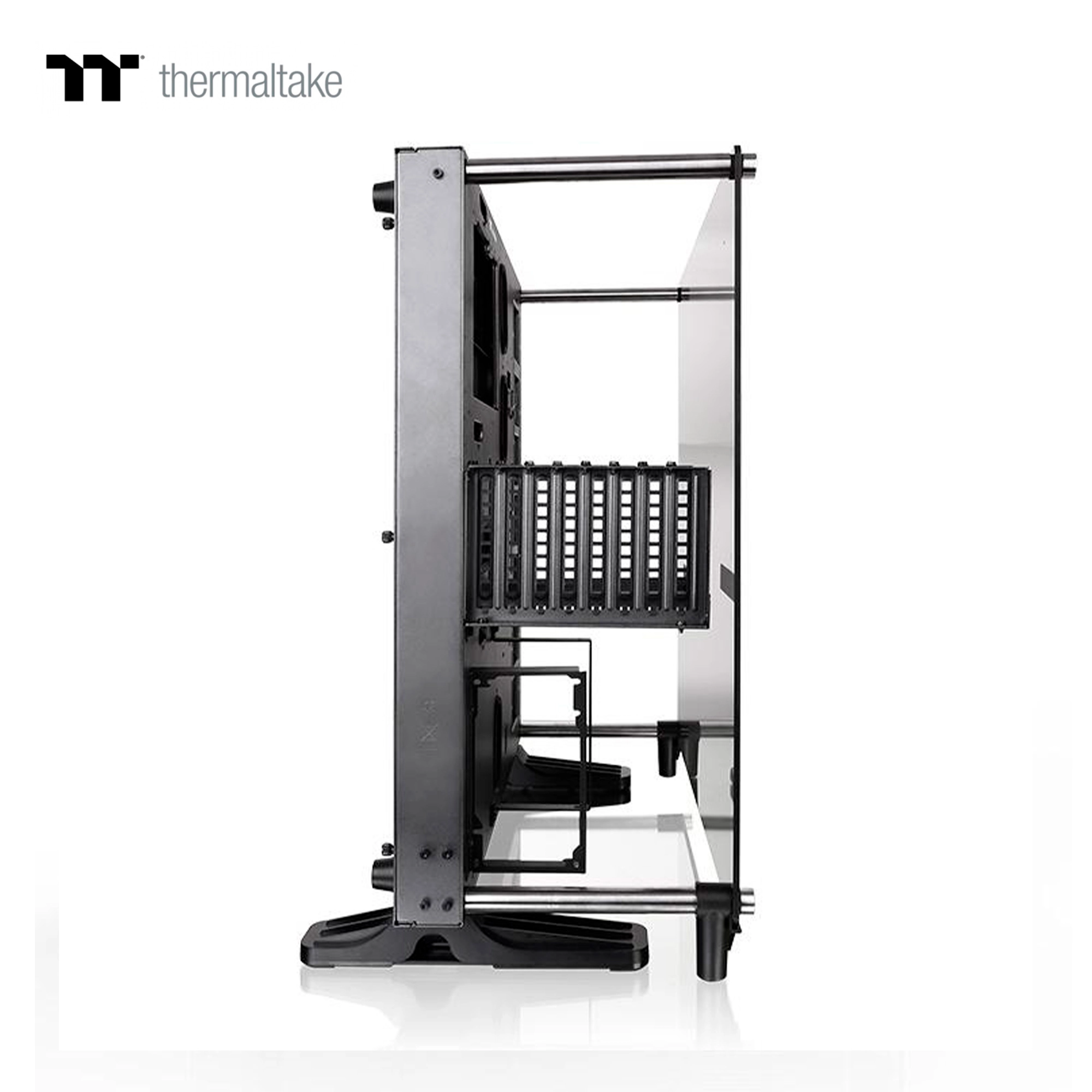 Модель Core P5 Tempered Glass Ti відноситься до корпусів елітного класу, а його головною особливістю є відкрита структура з однієї скляною панеллю. Завдяки відкритій організації корпусу, обмеженого лише однією сталевою панеллю, на якій тримається вся начинка ПК, і бічною скляною панеллю, корпус можна розташувати вертикально, горизонтально, повісити на стіну. Обладнавши корпус сучасними комплектуючими з синхронізованим підсвічуванням, можна домогтися неймовірного зовнішнього вигляду. Структура корпусу продумана до останньої дрібниці, що дозволяє втілити в ньому всі найсміливіші ідеї при збірці ПК своєї мрії. Тут прекрасно розташується система рідинного охолодження з підсвічуванням. Також є спеціальний кронштейн для установки до двох відеоадаптерів паралельно материнській платі, що дозволить збірці виглядати ще краще. І якщо в музеях вішають на стіни відомі картини, то ви зможете з гордістю повісити у себе вдома корпус Core P5 Ti, як теж свого роду витвір мистецтва.