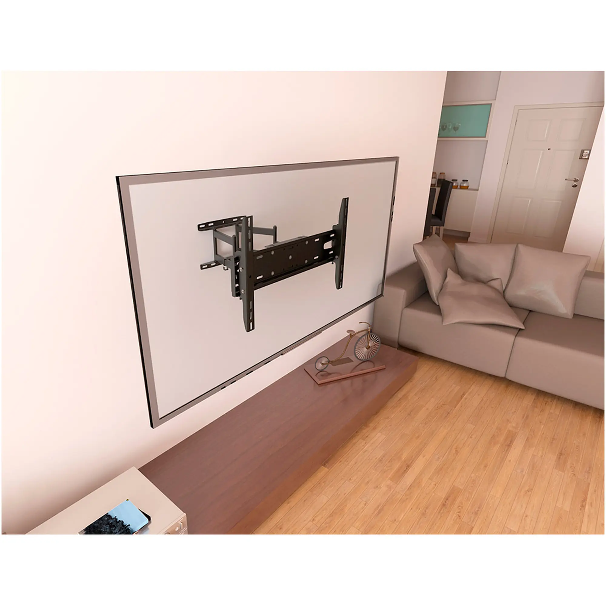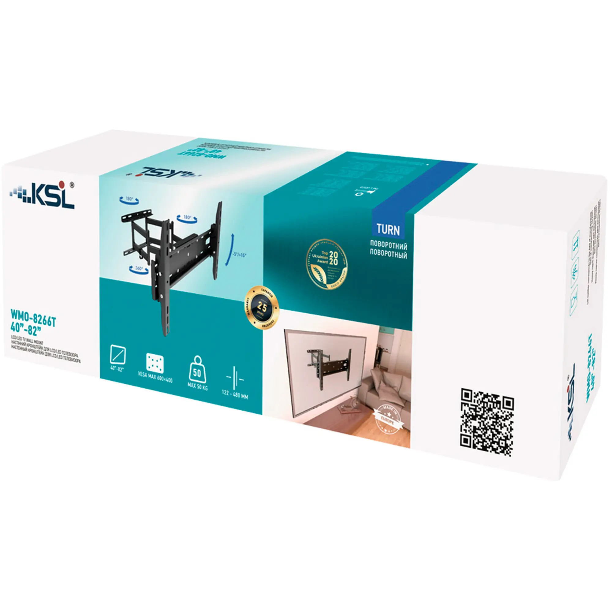 Модель KSL WMO-8266T оснащена нахильно-поворотним механізмом, який забезпечує широкий діапазон регулювання положення екрана. Плавний поворот ліворуч і праворуч, а також зміна кута нахилу дозволяють вибрати максимально зручний кут перегляду, уникнути відблисків і адаптувати положення телевізора до освітлення та розташування глядачів. Механізм працює м’яко та надійно фіксується, гарантує комфорт і безпеку навіть для важких панелей.