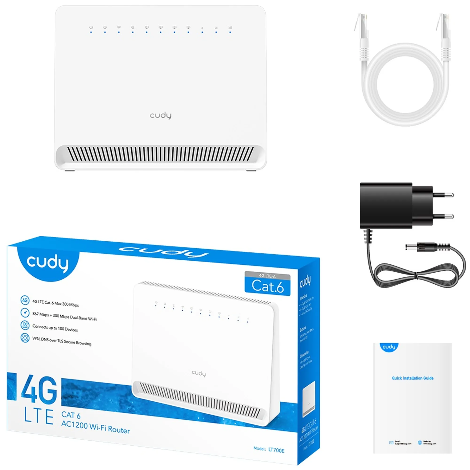 Роутер Cudy LT700E є універсальним рішенням для забезпечення надійного інтернет-з'єднання в будь-яких умовах. Завдяки підтримці 4G LTE Cat 6, пристрій здатний надавати швидкість мобільного інтернету до 300 Мбіт/с, що робить його ідеальним вибором як для використання вдома, так і в офісі або на дачі. Підтримка dual-band Wi-Fi AC1200 дозволяє роутеру забезпечувати високошвидкісне підключення по бездротовій мережі, досягаючи 867+300 Мбіт/с. Це означає, що користувачі можуть насолоджуватися безперебійною потоковою передачею, онлайн-іграми та іншими інтернет-активностями без затримок і переривань.