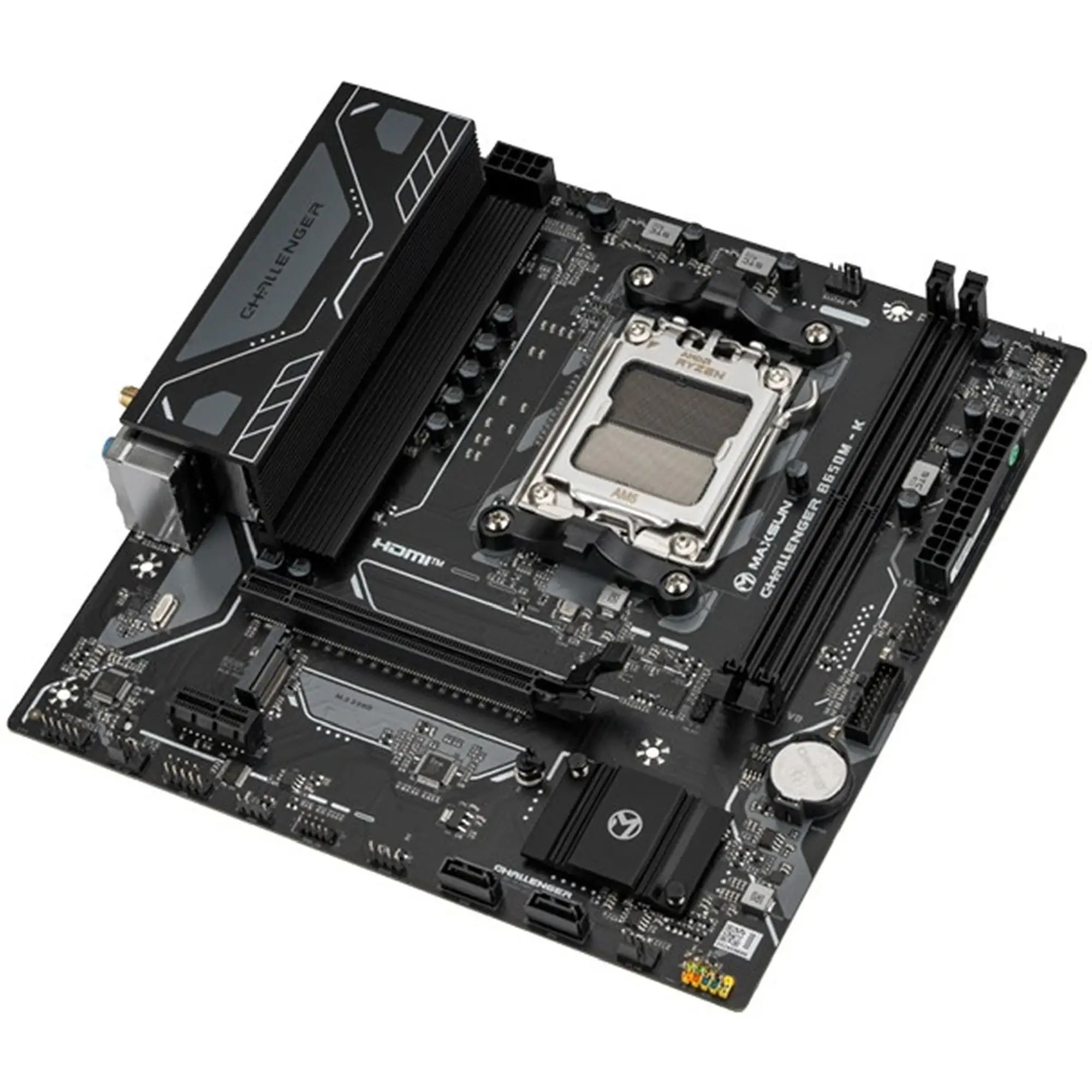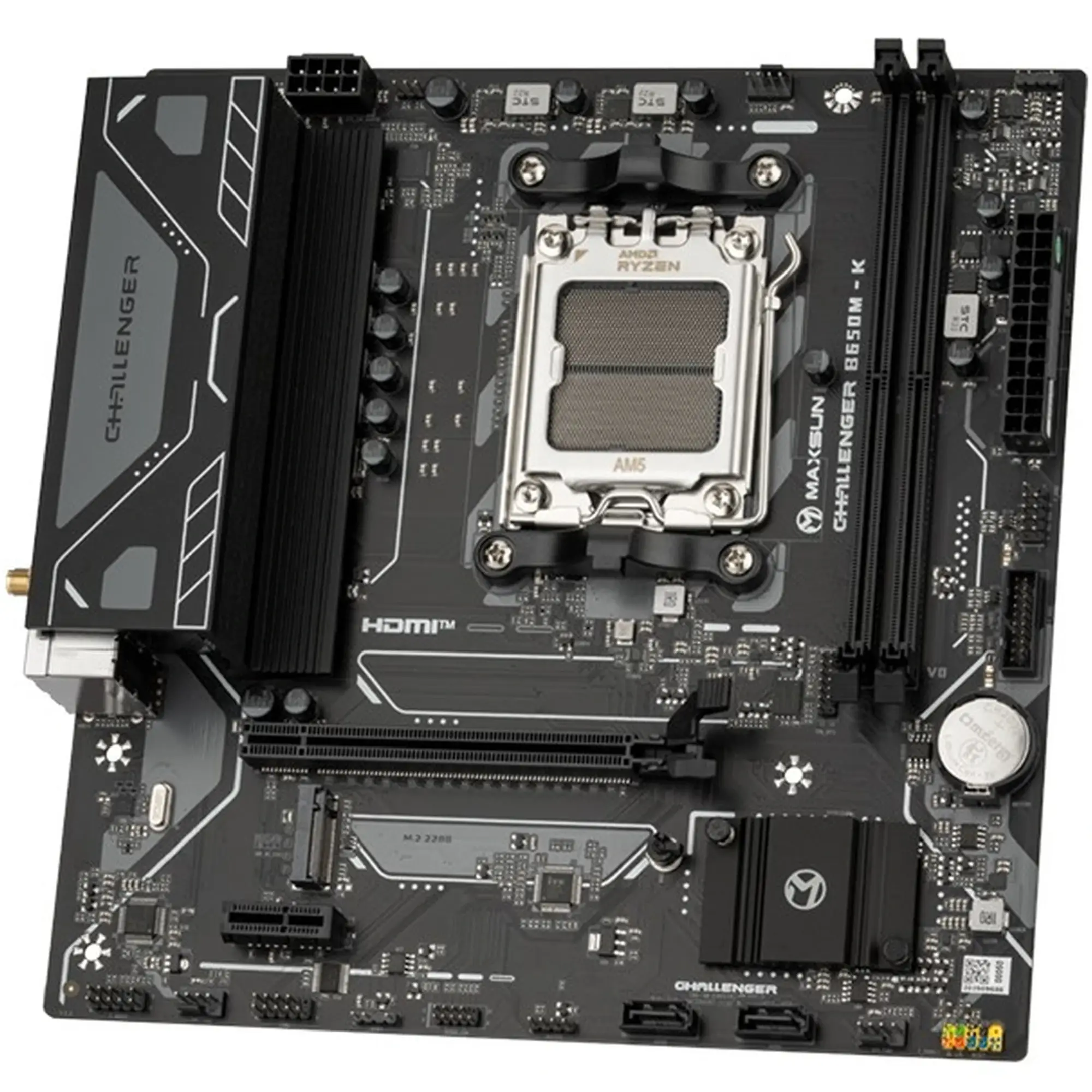 Материнська плата Maxsun MS-Challenger B650M-K WIFI — це компактний фундамент формату M-ATX (225 × 220 мм) для сучасних систем на платформі AMD® AM5. Вона підтримує процесори серій AMD® Ryzen™ 7000, 8000 і 9000, що відкриває широкий діапазон сценаріїв — від просунутого геймінгу до ресурсомістких робочих завдань. На базі чипсета AMD® B650 плата пропонує актуальний набір інтерфейсів і високу стабільність для систем нового покоління.