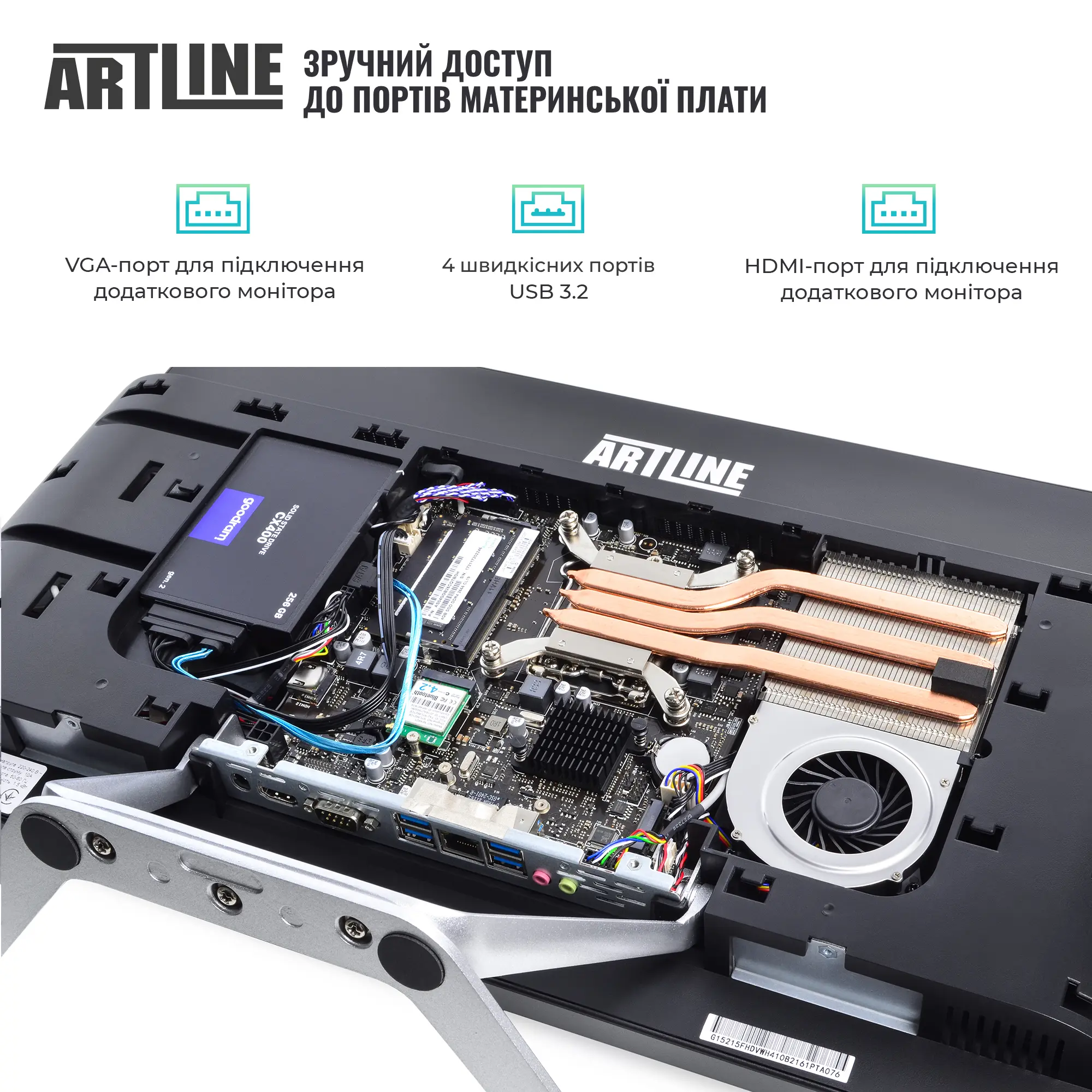 Моноблок виконаний у стильному корпусі Artline G15 H610 у чорно-сріблястому виконанні. Завдяки компактним розмірам (500x375x54 мм) та підтримці VESA-кріплення пристрій можна встановити як на робочому столі, так і на стіні. Це дозволяє максимально раціонально використовувати простір.