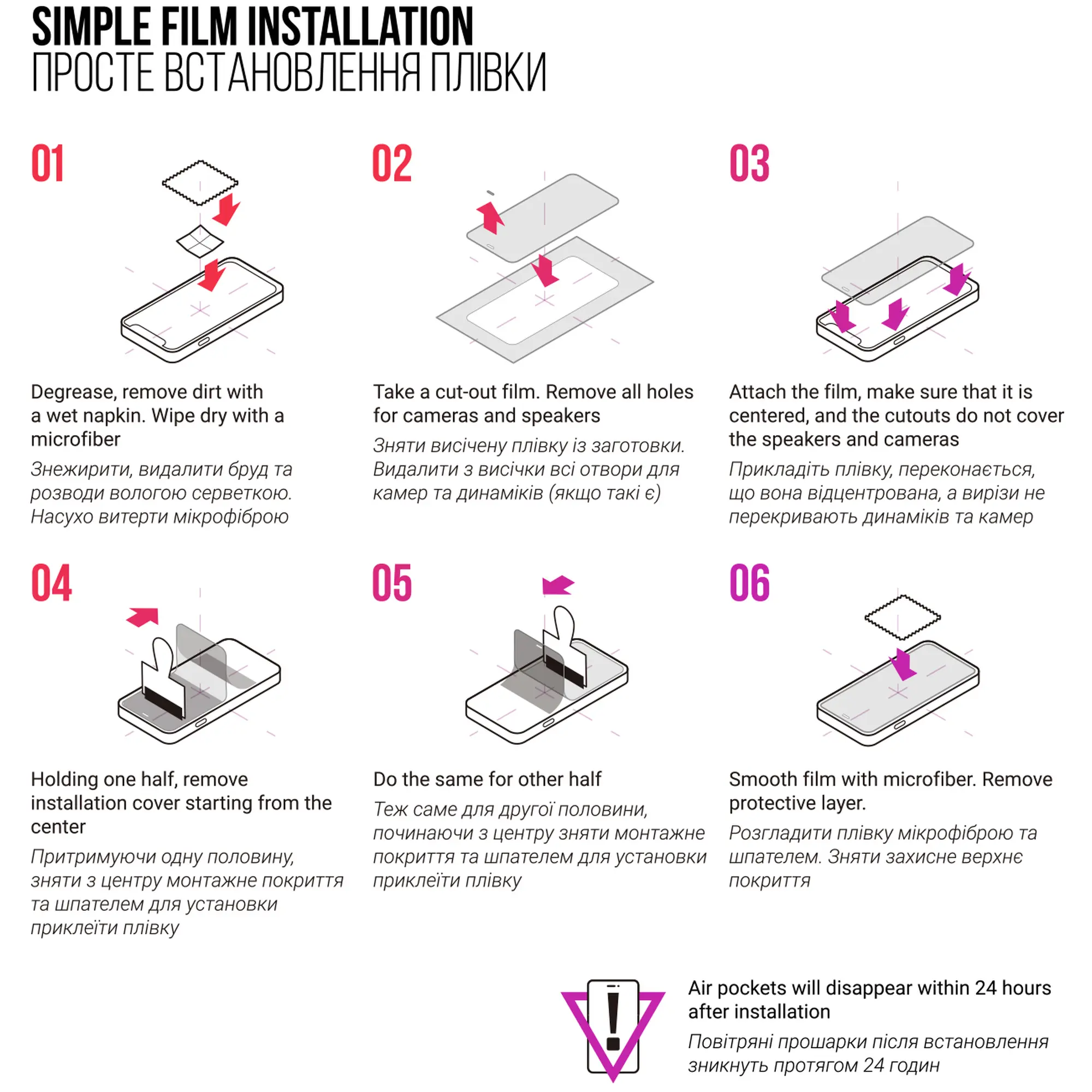 Плівки виготовлені з сучасного гідрогелевого матеріалу, який вирізняється гнучкістю та здатністю до самовідновлення. Він щільно прилягає до поверхні екрана, не утворює бульбашок, не впливає на чутливість сенсора та забезпечує плавне ковзання пальців. Поверхня стійка до подряпин, потертостей і відбитків пальців, легко очищується та зберігає охайний вигляд навіть після тривалого використання. Завдяки тонкій структурі матеріал майже непомітний, не спотворює кольори та зберігає якість зображення дисплея Samsung S21.