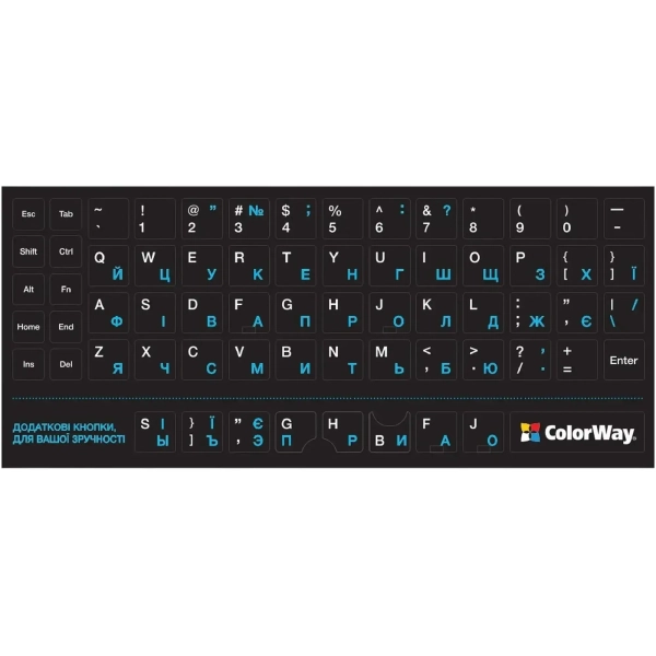 Наліпки на клавіатуру СolorWaу непрозорі чорні, біло-сині (CW-BWBL) – практичне рішення для тих, хто хоче освіжити зовнішній вигляд клавіатури та повернути чіткість позначень клавіш. Щільна чорна основа робить символи добре помітними, а біло-сині позначення створюють виражений контраст, завдяки чому літери легко читаються як удень, так і при штучному освітленні. Такий варіант оформлення підійде як для дому, так і для офісу.