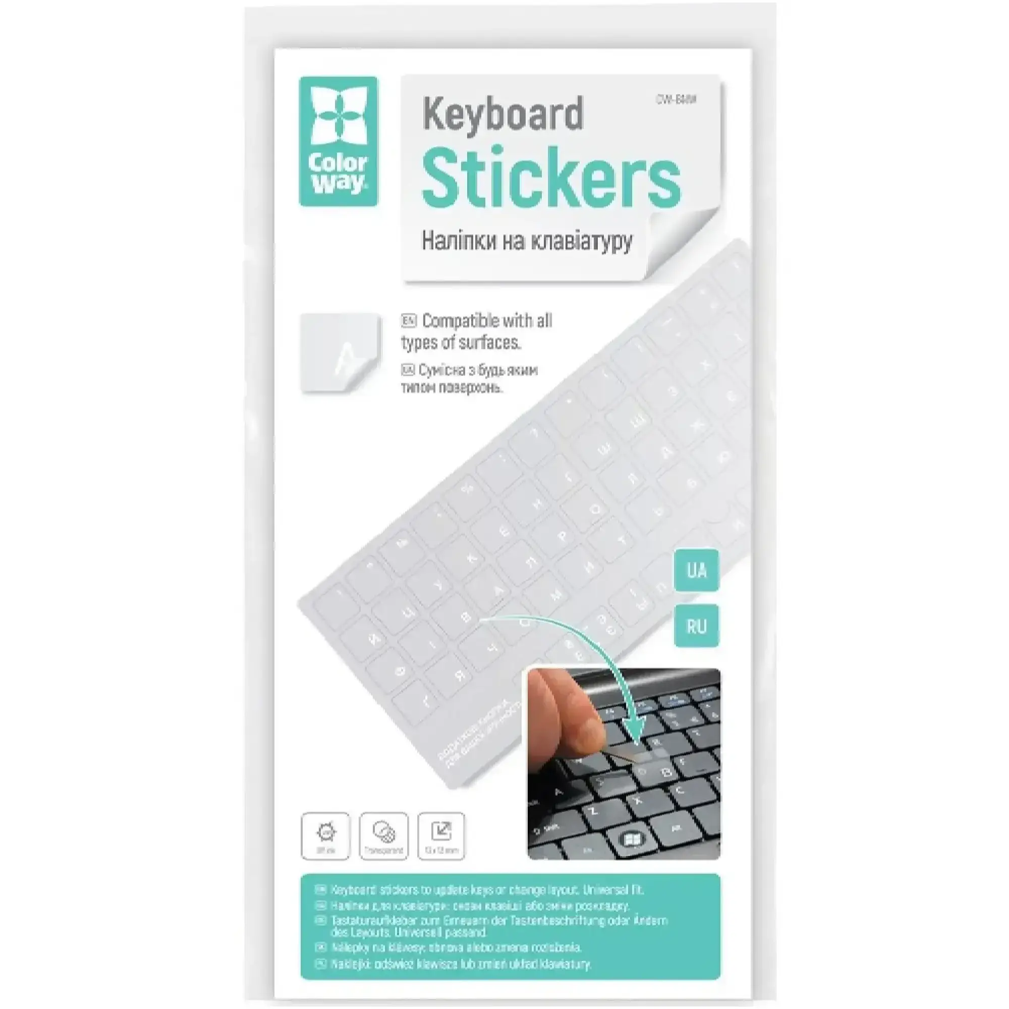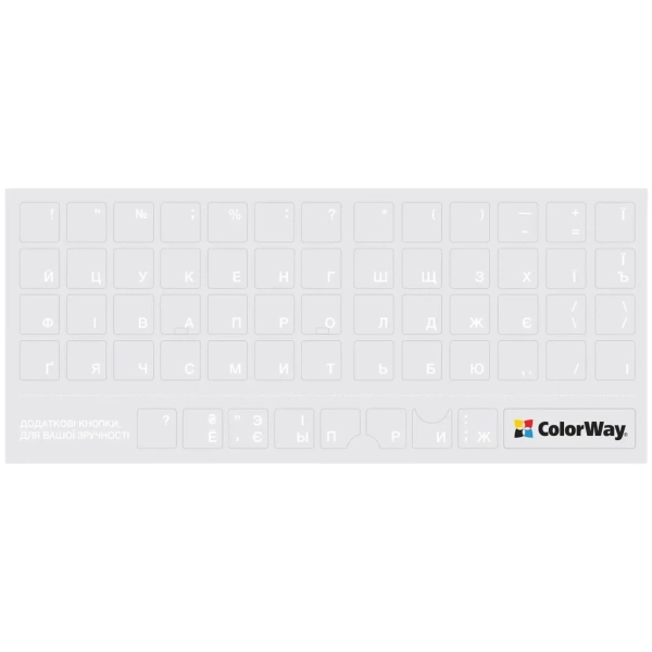 Універсальний формат наліпок СolorWaу прозора, біла (СW-NW) підходить для більшості ноутбучних і настільних клавіатур стандартного розміру. Розмір і форма елементів розраховані так, щоб вони акуратно лягали на клавіші й не заважали натисканню. Тонкий матеріал не потовщує поверхню, не ковзає й не чіпляється за пальці, зберігаючи звичні тактильні відчуття під час набору тексту.