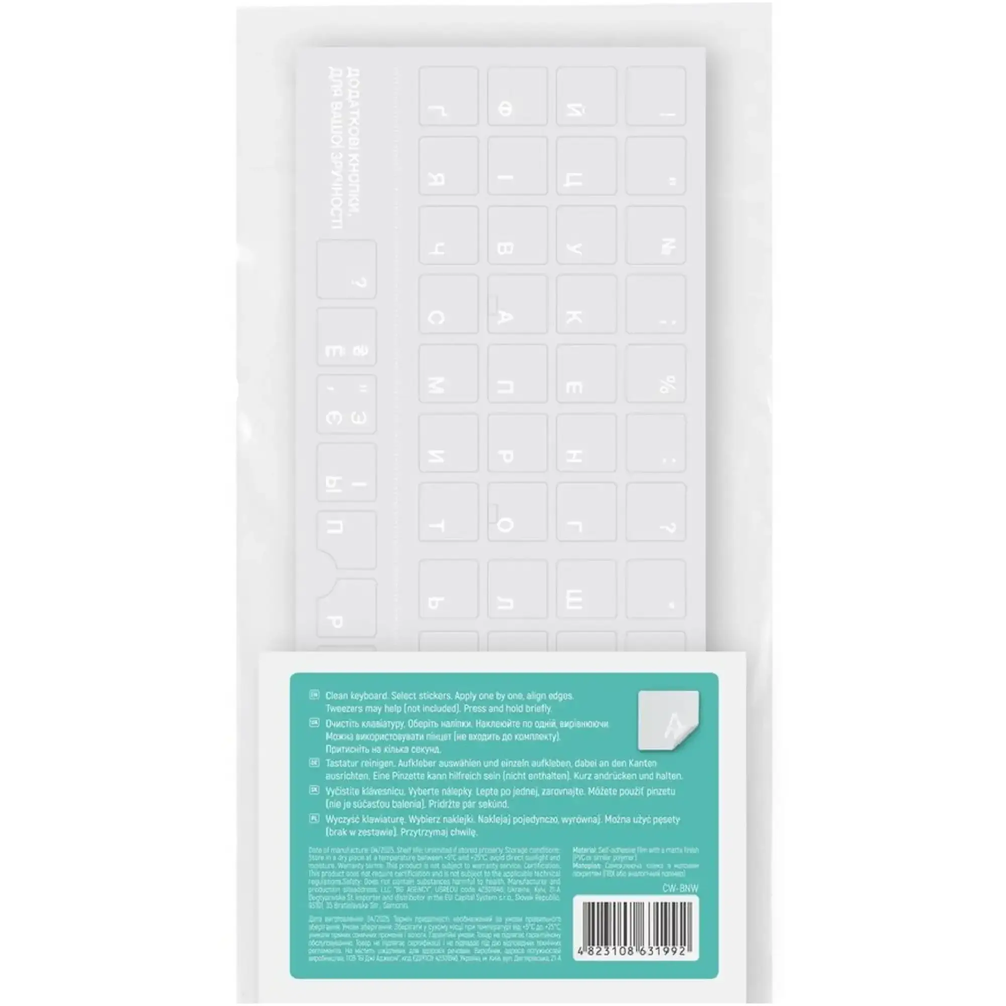 Наліпки Наклейки на клавіатуру СolorWaу прозора, біла (СW-NW) – практичне рішення для тих, хто хоче оновити символи на клавішах і водночас зберегти оригінальний дизайн пристрою. Прозора основа практично непомітна на клавіатурі, тому її колір і фактура залишаються незмінними, а білі позначення виглядають акуратно й сучасно. Такий варіант особливо зручний для власників стильних ноутбуків і настільних клавіатур, де важливо зберегти початковий зовнішній вигляд.