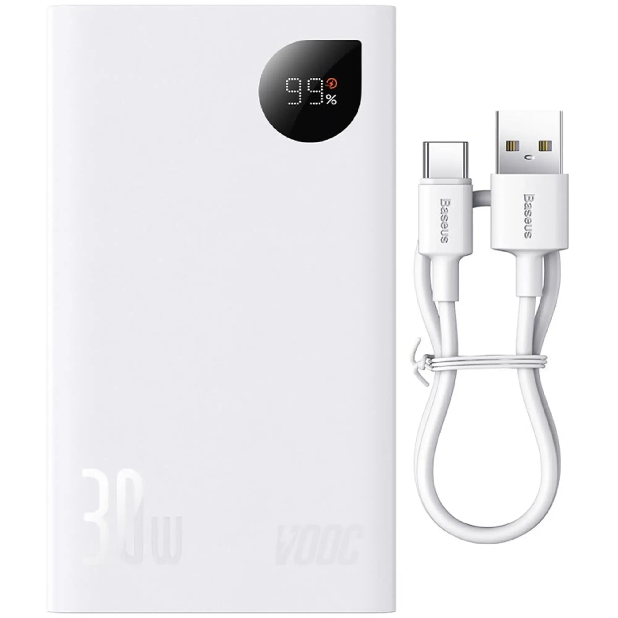 Baseus Adaman2 - це не тільки функціональний, але й стильний аксесуар. Він виконаний в елегантному білому корпусі з міцного матового пластику з текстурою, що не залишає відбитків пальців. Це не тільки запобігає ковзанню пристрою в руках, але й надає йому сучасний вигляд. Цифровий LED-дисплей дозволяє легко стежити за рівнем заряду акумулятора та відображає всю необхідну інформацію.